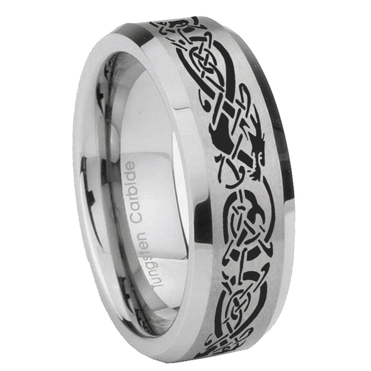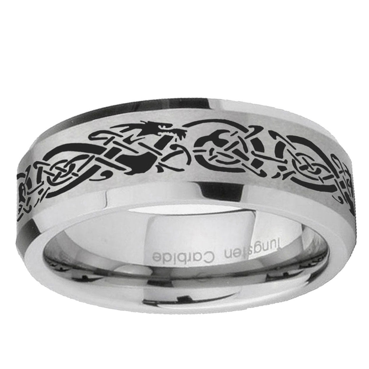 Introducing 6, 8mm Celtic Knot Dragon Beveled Edge Brushed Grey Tungsten Mens Ring Personalized . Offer in both 6mm and 8mm band width brushed grey finished from size 5 to 14