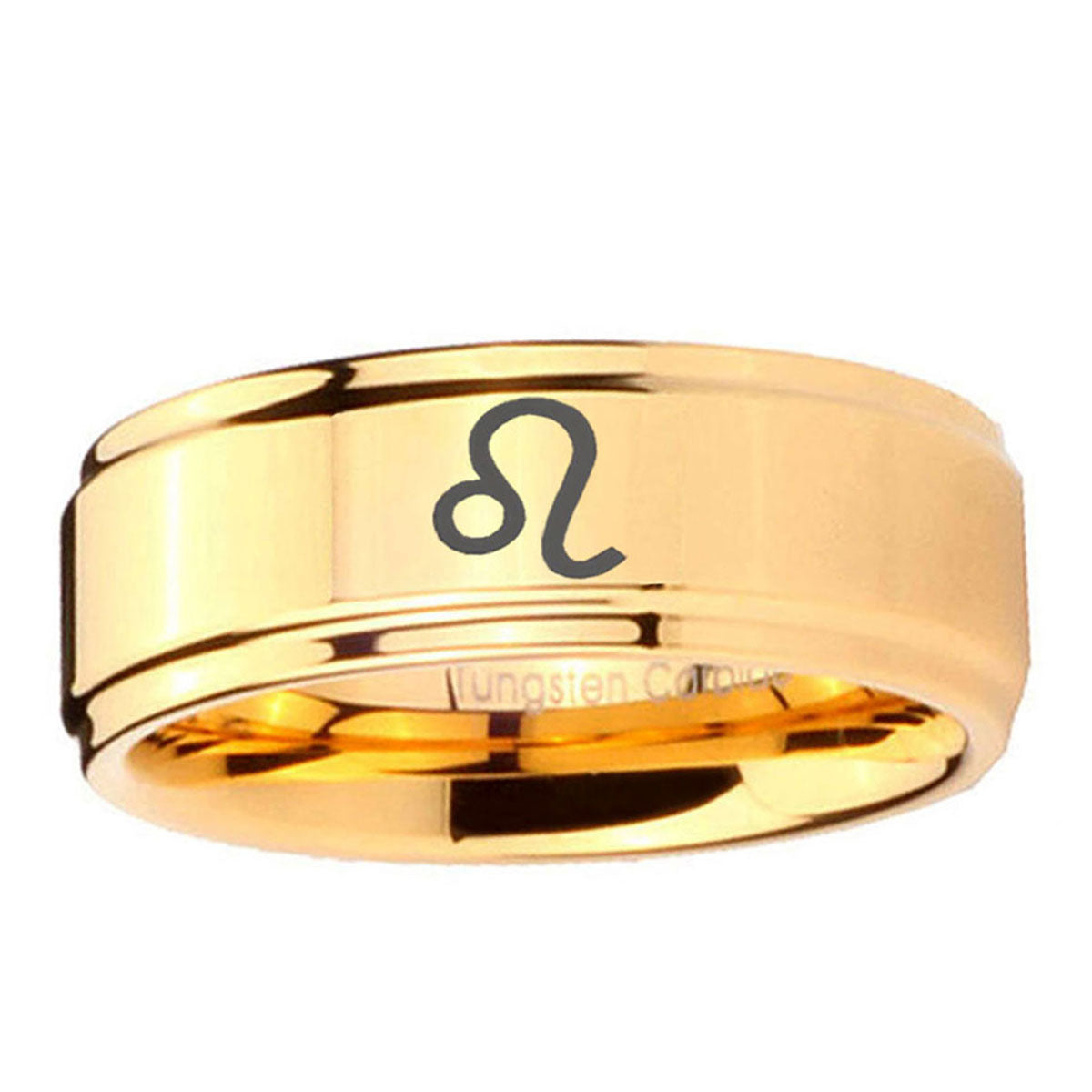 Intruding 5, 8mm Leo Zodiac Step Edge Gold Engraved Tungsten Rings . Offer in both 5mm and 8mm band width 18k gold plated finished from size 4 to 14