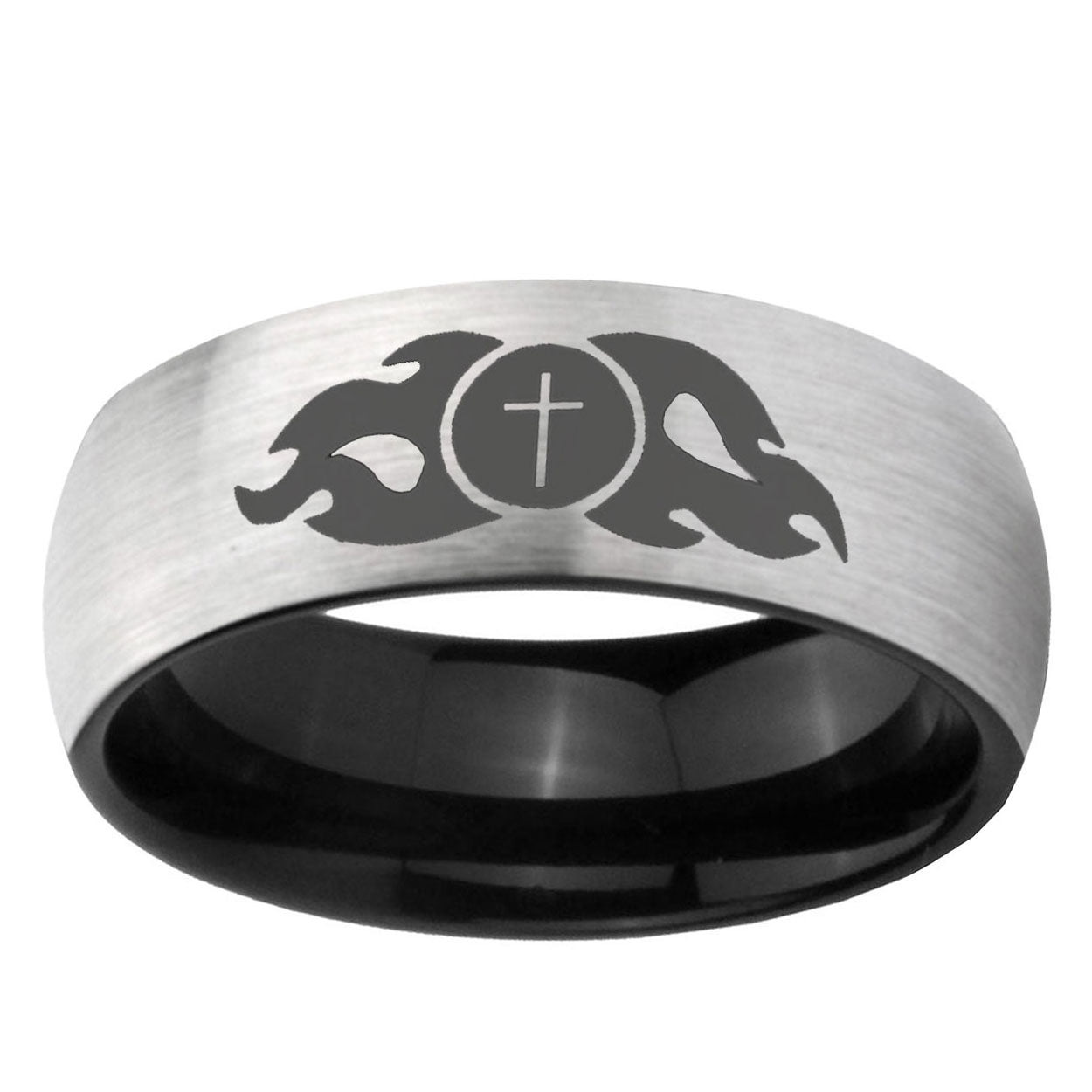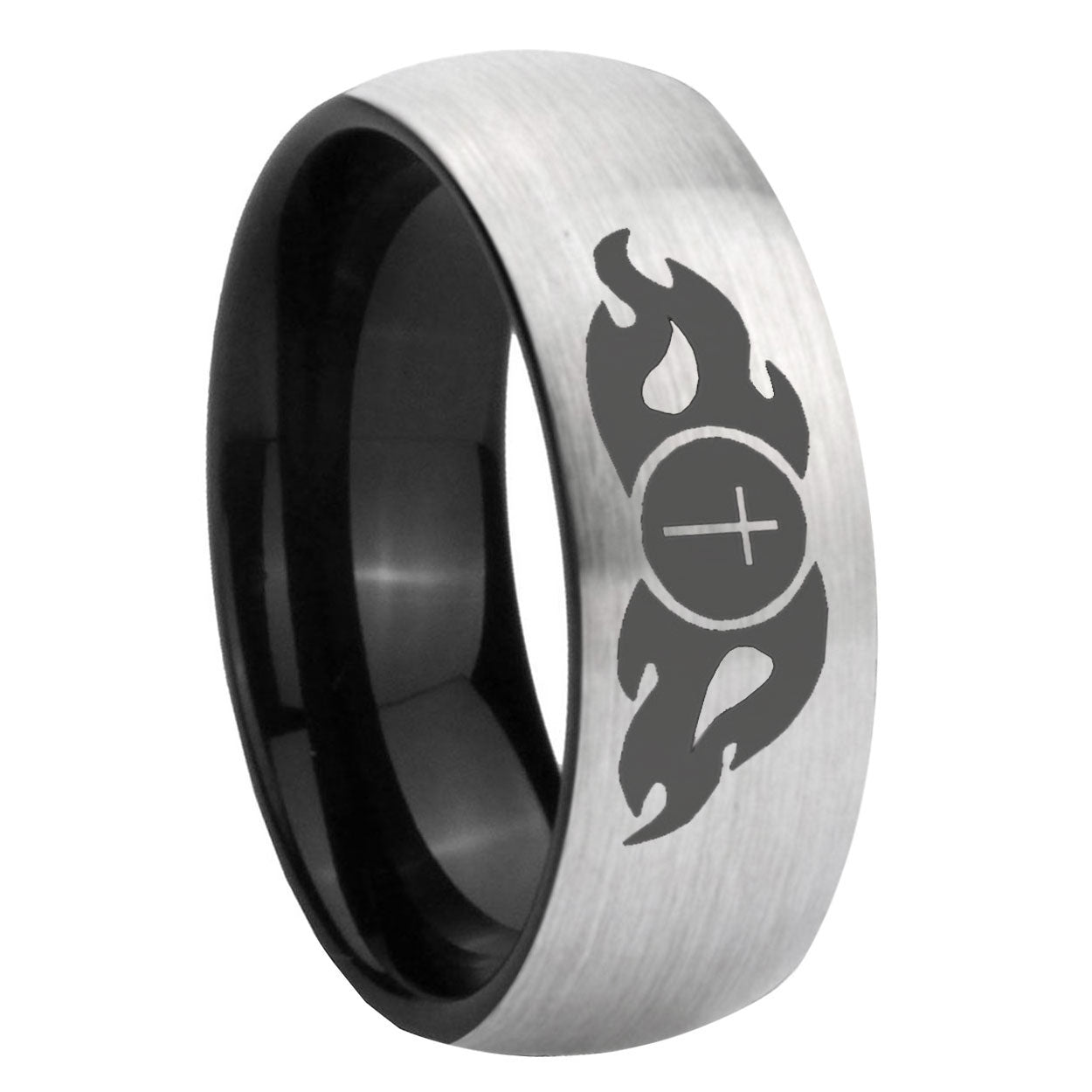 Intruding 6, 8mm Flamed Cross Dome Gray And Black Tungsten Carbide Wedding Band Ring . Offer in both 6mm and 8mm band width Gray And Black plated finished from size 5 to 14