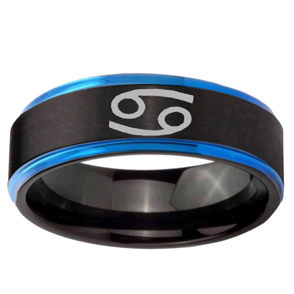 5, 8mm Cancer Horoscope Blue Step Edge Black Tungsten Carbide Wedding Bands Ring