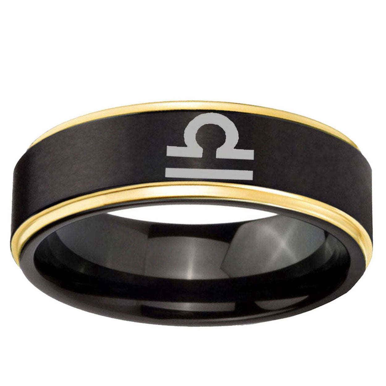 Intruding 6, 8mm Libra Horoscope Gold Step Edge Black Tungsten Carbide Bands Ring . Offer in both 6mm and 8mm band width black plated finished from size 5 to 14