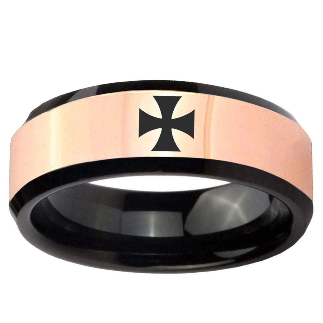 8mm Maltese Cross Rose Gold And Black Beveled Edge Tungsten Carbide Men's Ring