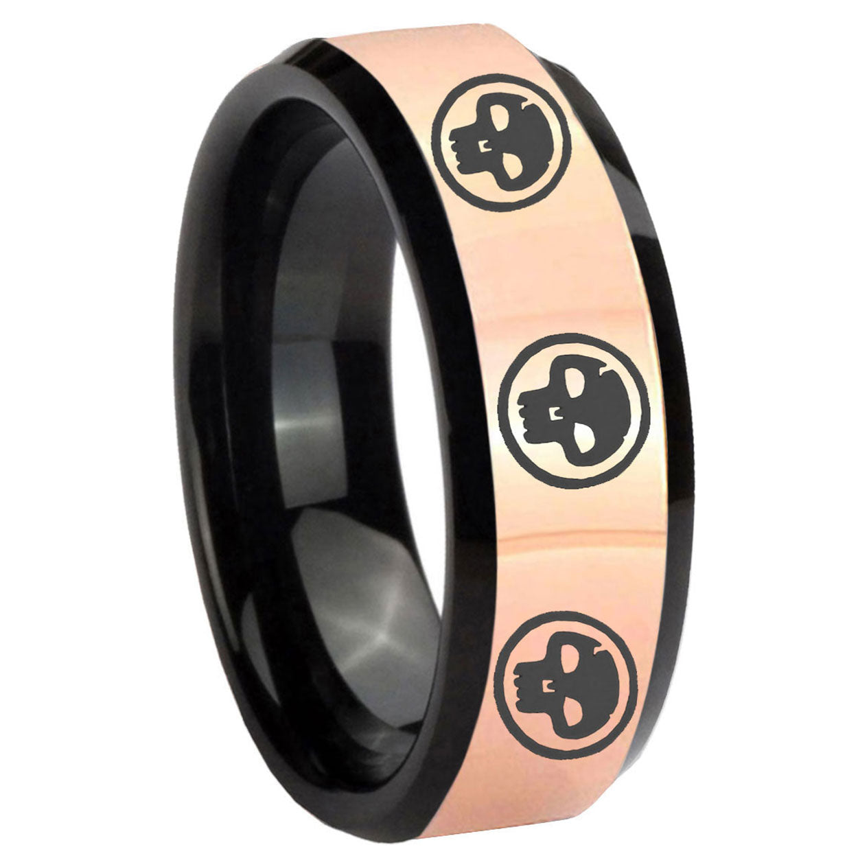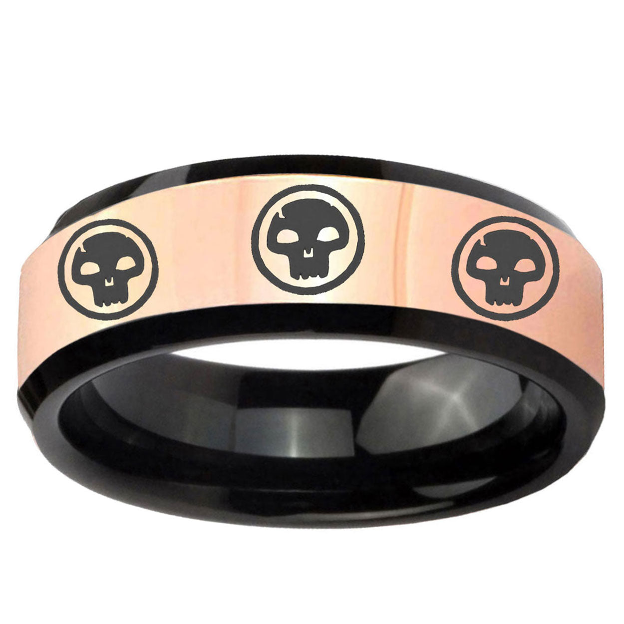 Intruding 8mm Multiple Skull Rose Gold And Black Beveled Edge Tungsten Carbide Anniversary Ring . Offer in men wedding band in 8mm band width rose gold black plated finished from size 7 to 14