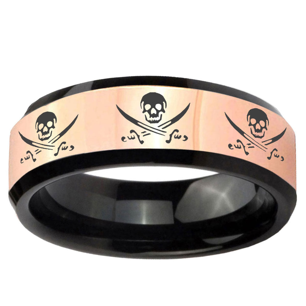 8mm Multiple Skull Pirate Rose Gold And Black Beveled Edge Tungsten Engagement Ring