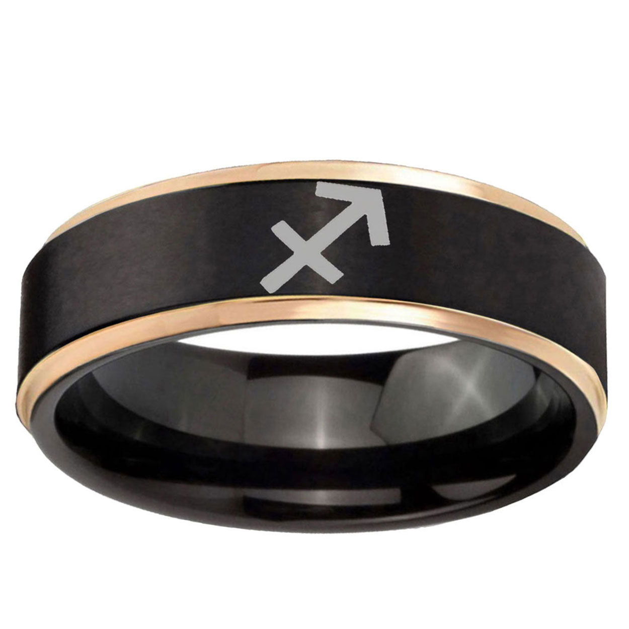 Intruding 6, 8mm Sagittarius Zodiac Rose Gold Step Edge Black Tungsten Custom Ring for Men . Offer in both 6mm and 8mm band width black plated finished from size 6 to 14