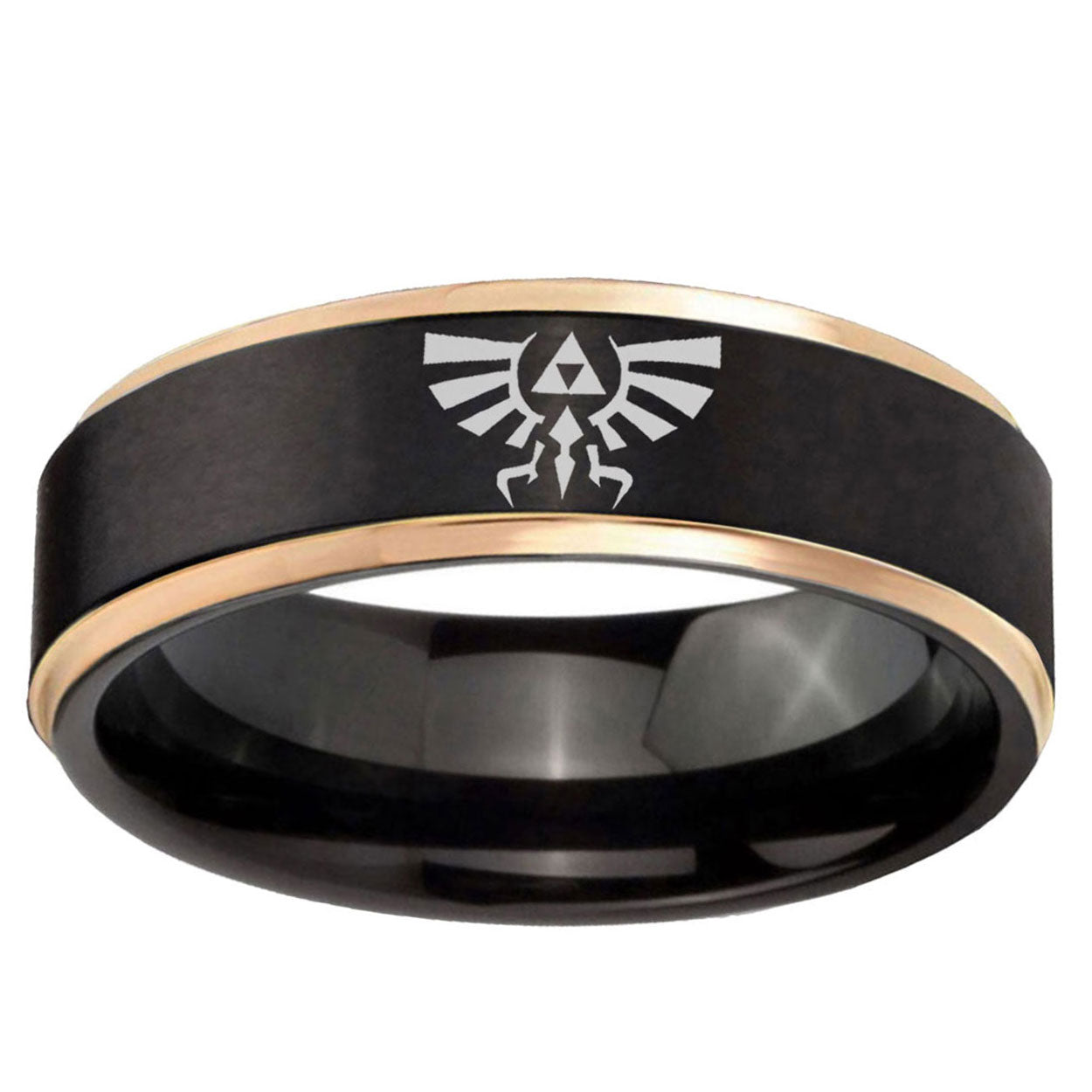 Intruding 6, 8mm Zelda Skyward Sword Rose Gold Step Edge Black Tungsten Anniversary Ring . Offer in both 6mm and 8mm band width black plated finished from size 6 to 14