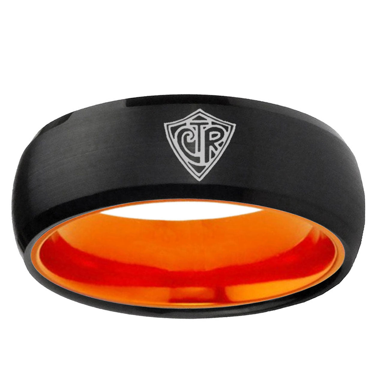 Intruding 8mm CTR Dome Black And Orange Tungsten Carbide Mens Promise Ring . Offer in men wedding band in 8mm band width Black And Orange plated finished from size 7 to 14