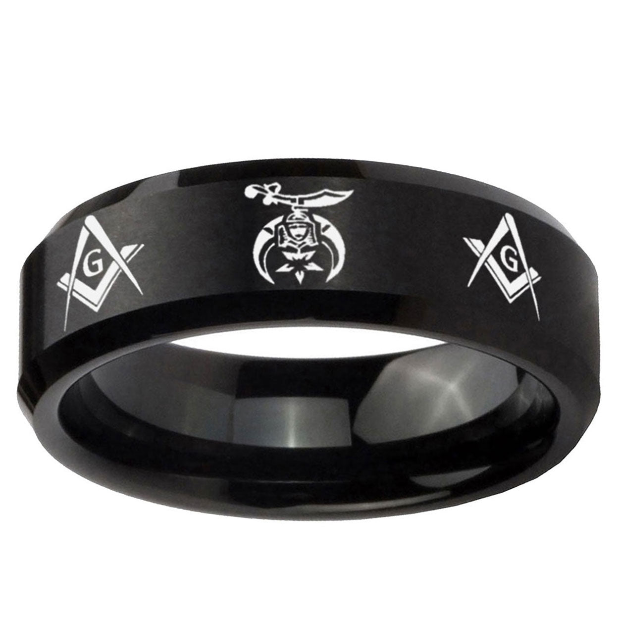 Intruding 5, 8mm Masonic Shriners Beveled Edges Brush Black Tungsten Men's Engagement Ring . Offer in both 5mm and 8mm band width brushed black plated finished from size 4 to 14