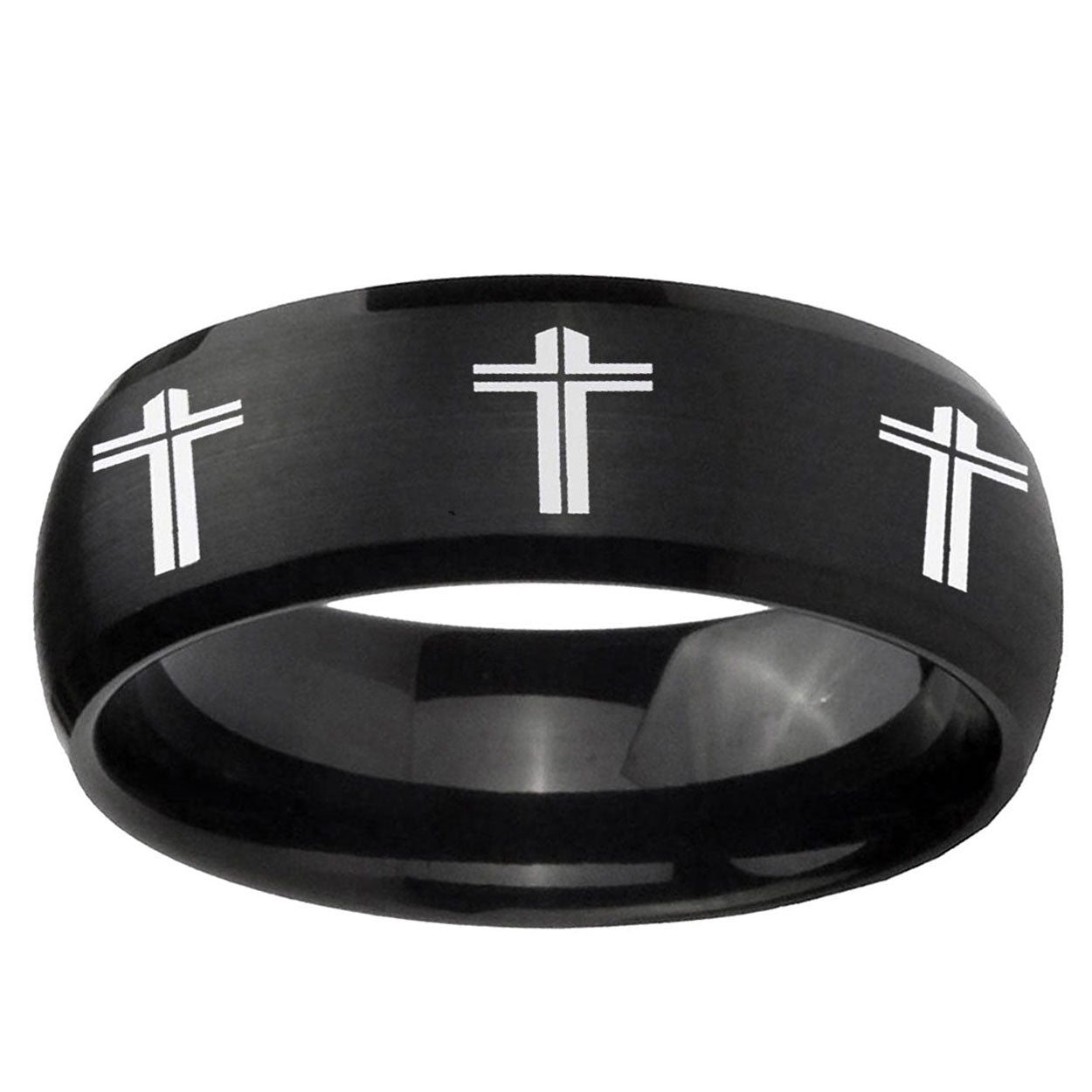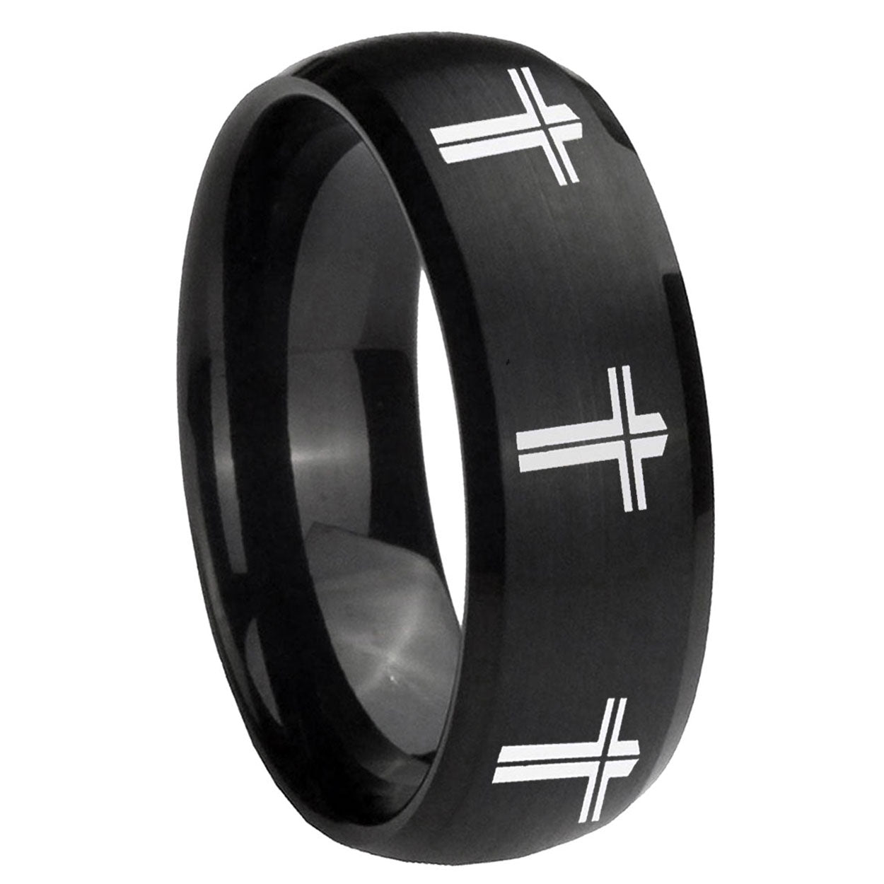 Intruding 5, 8mm Multiple Christian Cross Dome Brush Black Tungsten Mens Wedding Ring . Offer in both 5mm and 8mm band width brush black plated finished from size 4 to 14