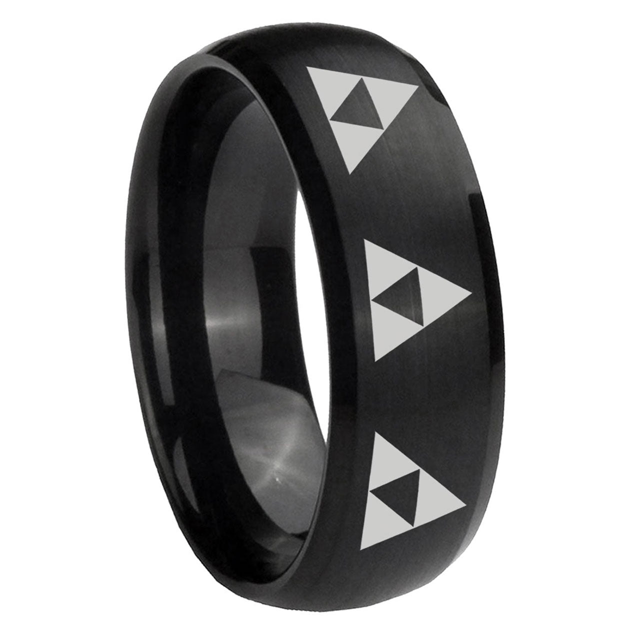 Intruding 5, 8mm Multiple Zelda Triforce Dome Brush Black Tungsten Carbide Men's Band Ring . Offer in both 5mm and 8mm band width brush black plated finished from size 4 to 14