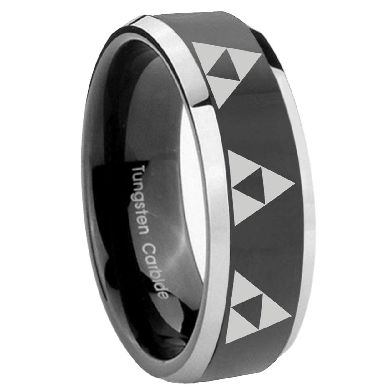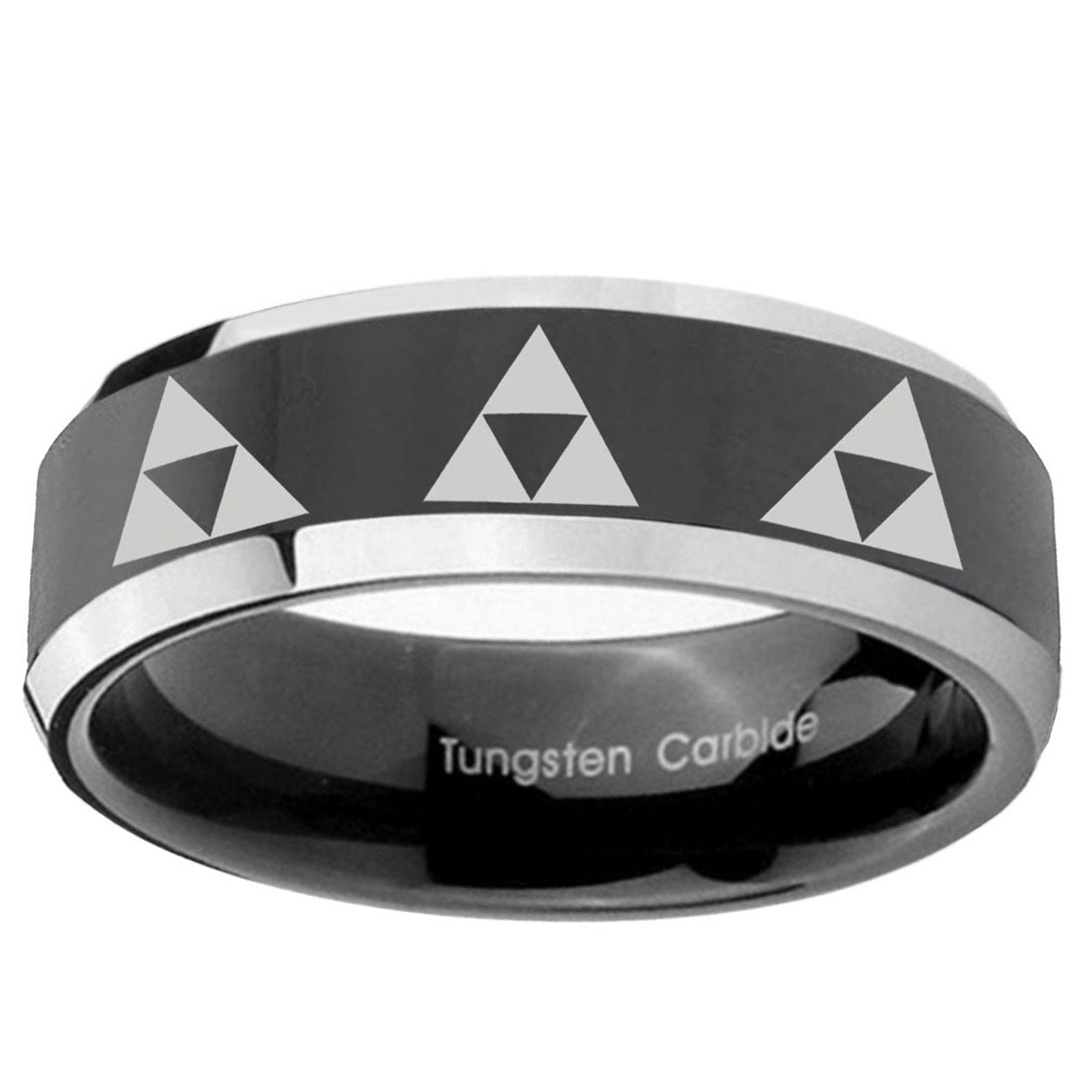 Intruding 5, 8mm Multiple Zelda Triforce Beveled Glossy Black 2 Tone Tungsten Mens Bands Ring . Offer in both 5mm and 8mm band width shiny black pated two tone finished from size 4 to 14