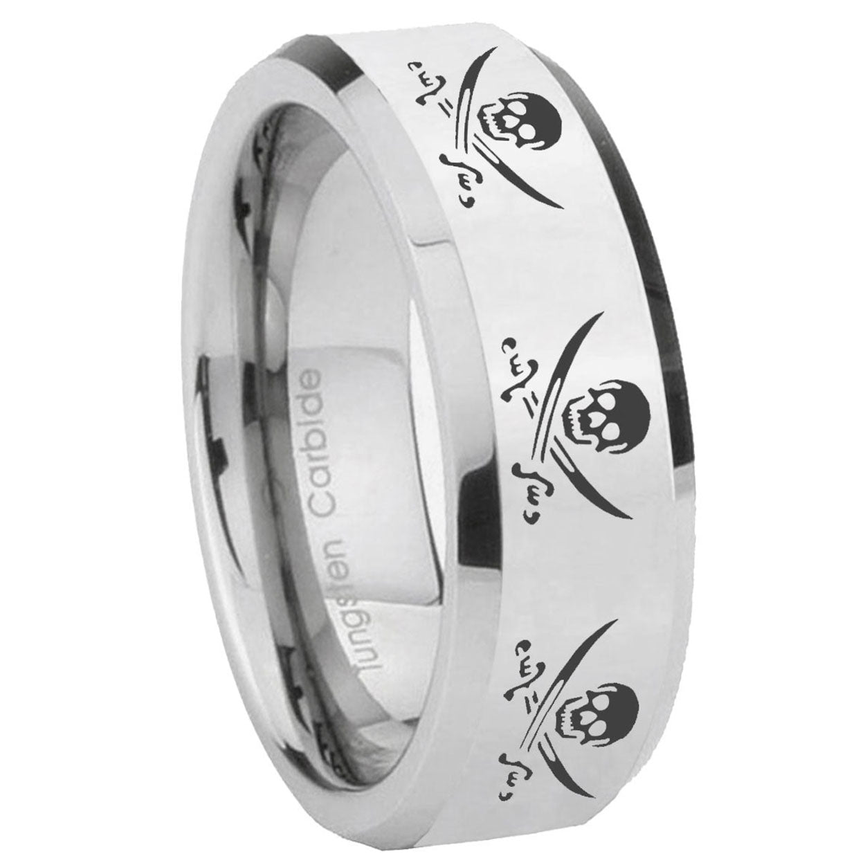 Intruding 5, 8mm Multiple Skull Pirate Beveled Edges Silver Tungsten Carbide Men's Ring . Offer in both 5mm and 8mm band width polished silver finished from size 4 to 14