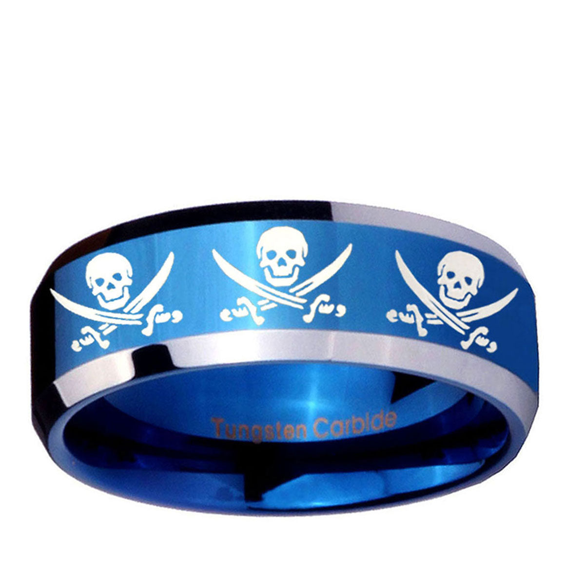 Intruding 5, 8mm Multiple Skull Pirate Beveled Blue 2 Tone Tungsten Mens Engagement Band . Offer in both 5mm and 8mm band width blue plated 2 tone finished from size 4 to 14
