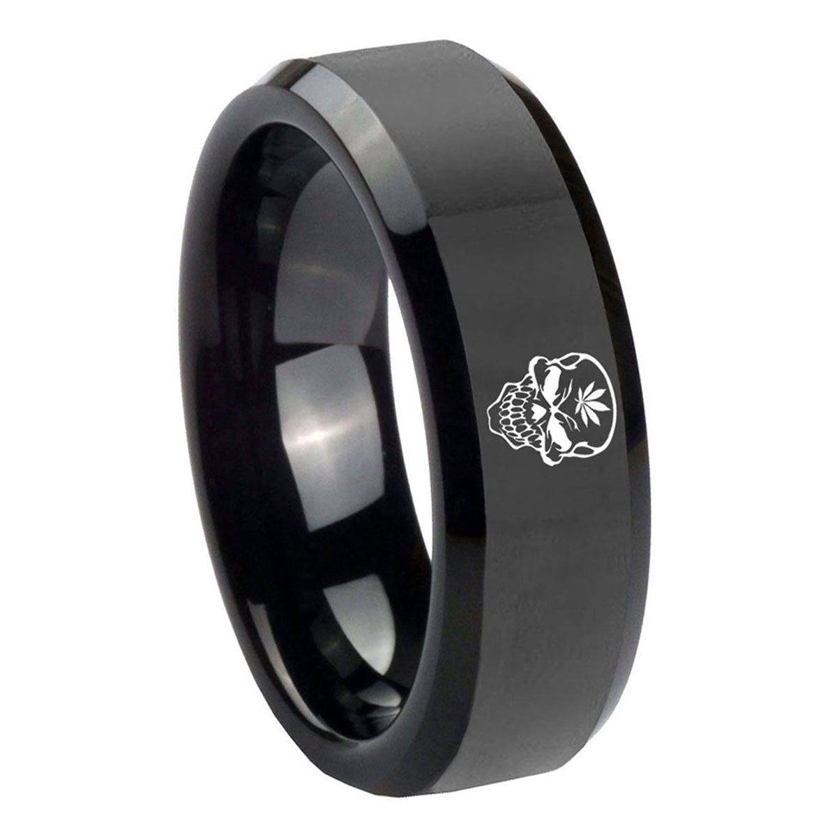 5, 8mm Skull Marijuana Leaf Beveled Edges Black Tungsten Mens Ring Personalized