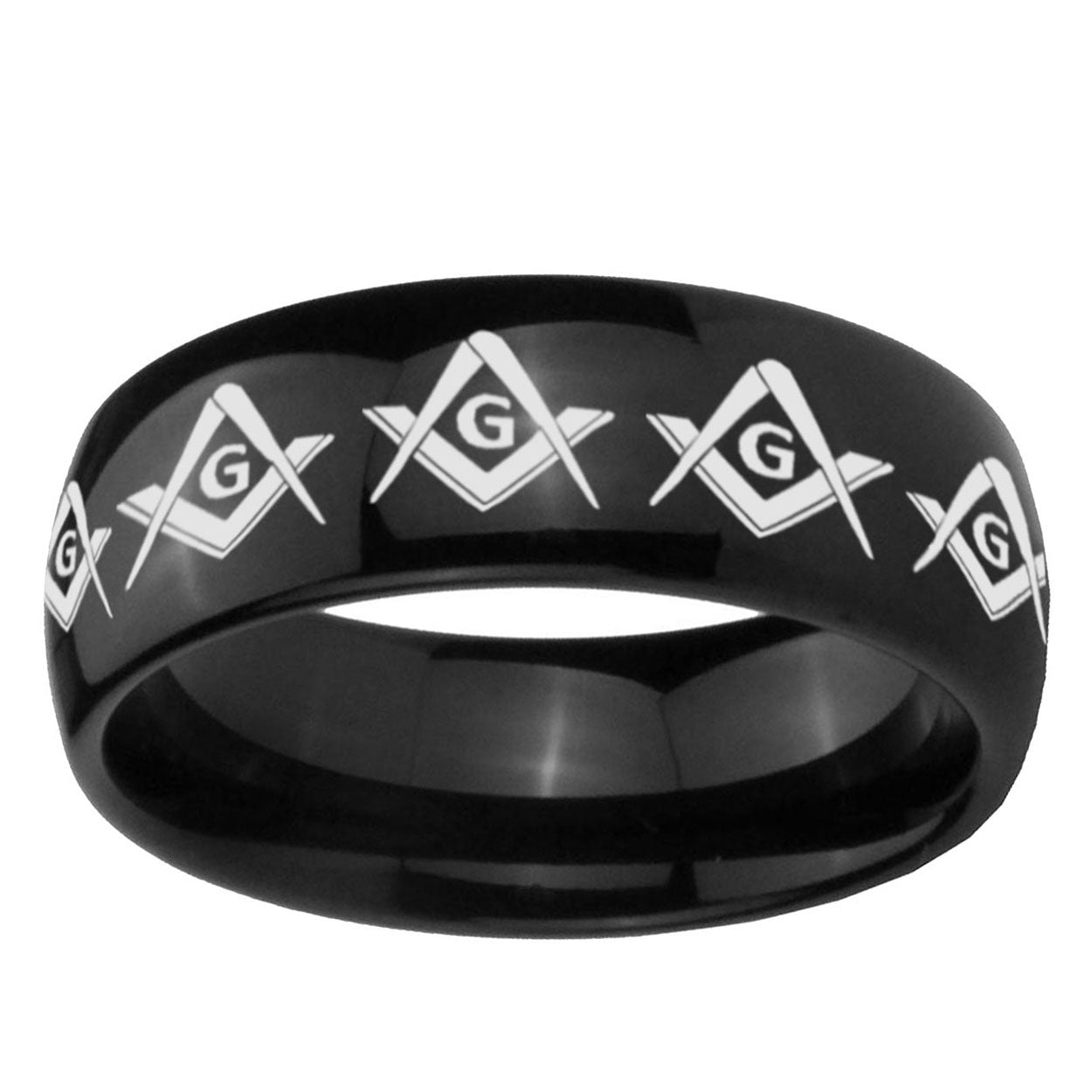 Intruding 5, 8mm Masonic Square and Compass Dome Black Tungsten Carbide Mens Anniversary Ring . Offer in both 5mm and 8mm band width polished black plated finished from size 4 to 14