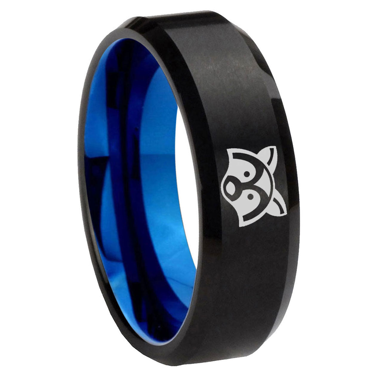 Intruding 5, 8mm Raccoon Animal Bevel Tungsten Carbide Blue Mens Promise Ring . Offer in both 5mm and 8mm band width black and blue plated finished from size 4 to 14