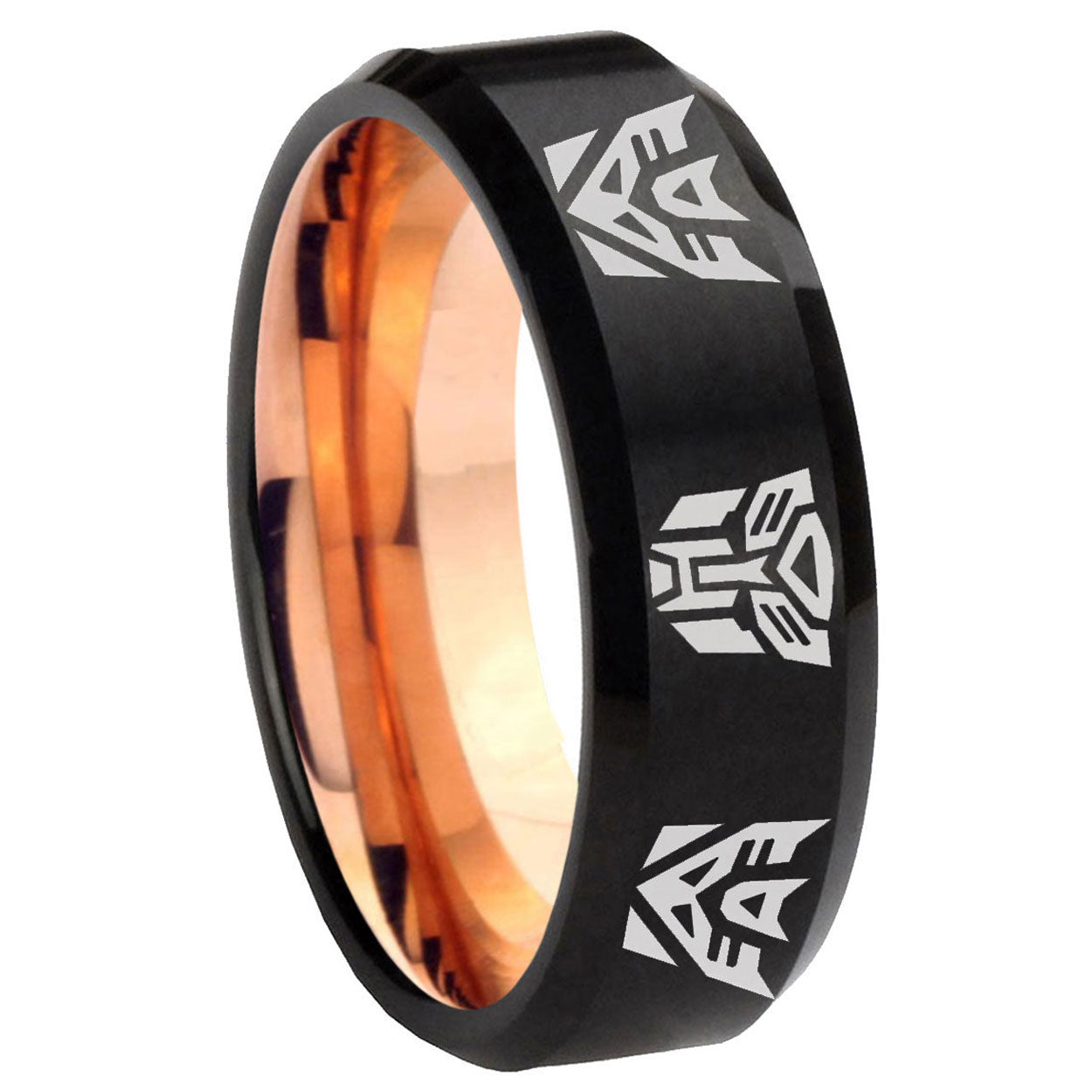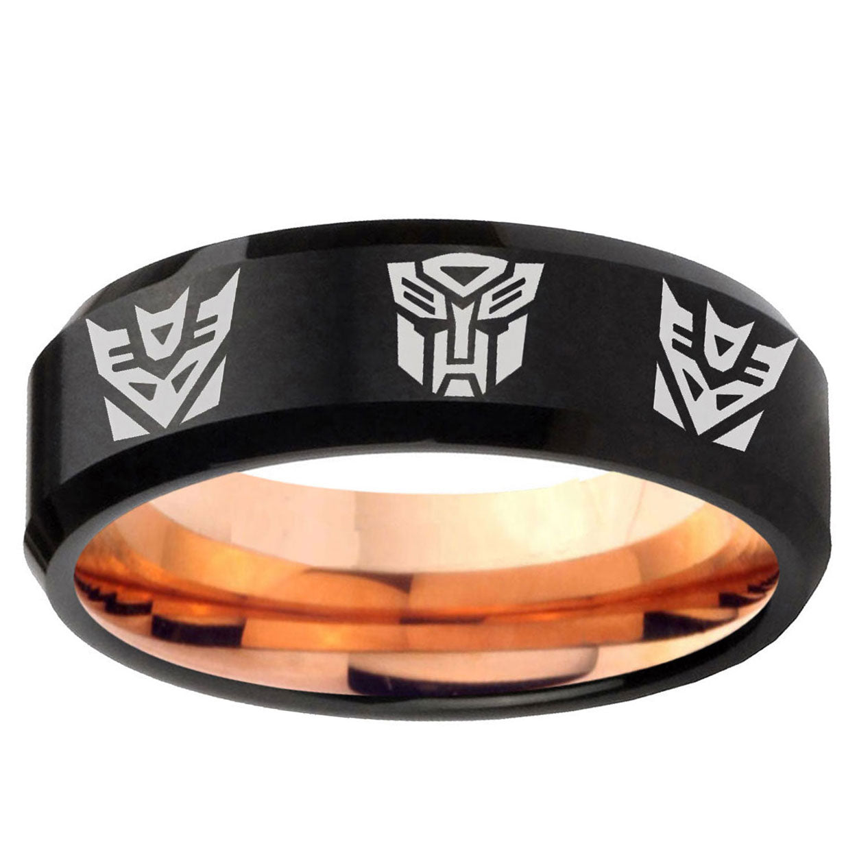 Intruding 5, 8mm Transformers Autobot Decepticon Beveled Edge Rose Gold and Black Tungsten Men's Ring . Offer in both 5mm and 8mm band width Rose Gold and Black finished from Size 4 to 14