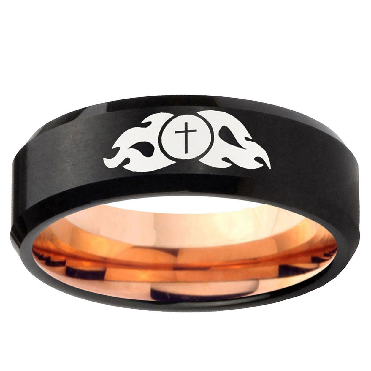 Intruding 5, 8mm Flamed Cross Beveled Edge Rose Gold and Black Tungsten Carbide Bands Ring . Offer in both 5mm and 8mm band width Rose Gold and Black finished from Size 4 to 14