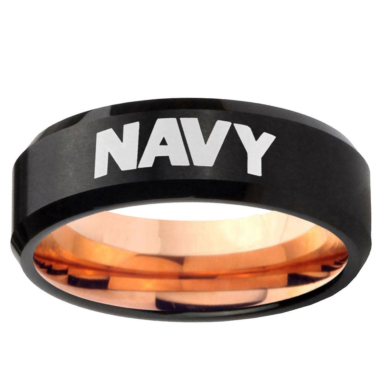 Intruding 5, 8mm Navy Beveled Edge Rose Gold and Black Tungsten Carbide Men's Wedding Ring . Offer in both 5mm and 8mm band width Rose Gold and Black finished from Size 4 to 14