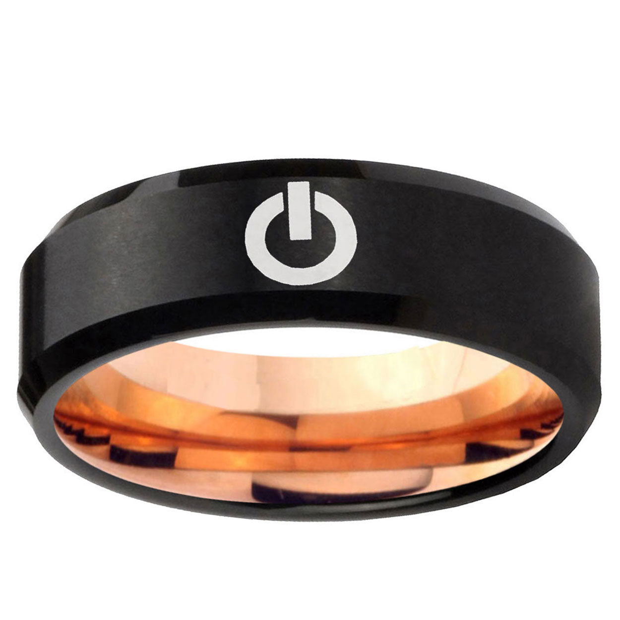 Intruding 5, 8mm Power Beveled Edge Rose Gold and Black Tungsten Men's Anniversary Ring . Offer in both 5mm and 8mm band width Rose Gold and Black finished from Size 4 to 14