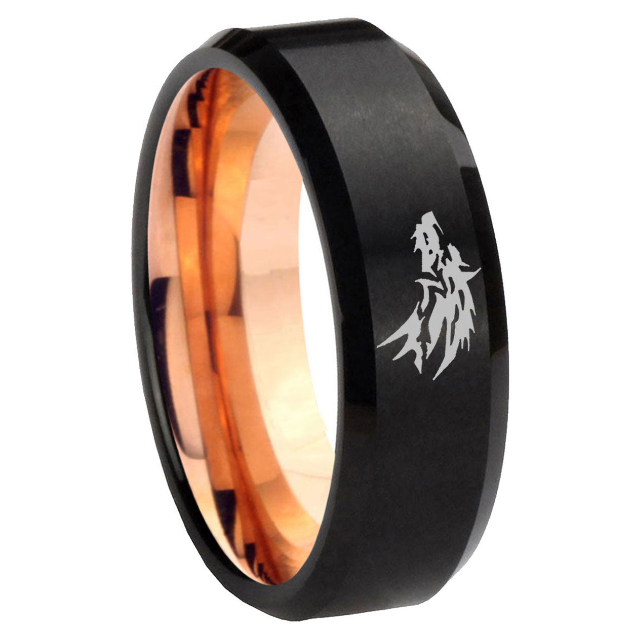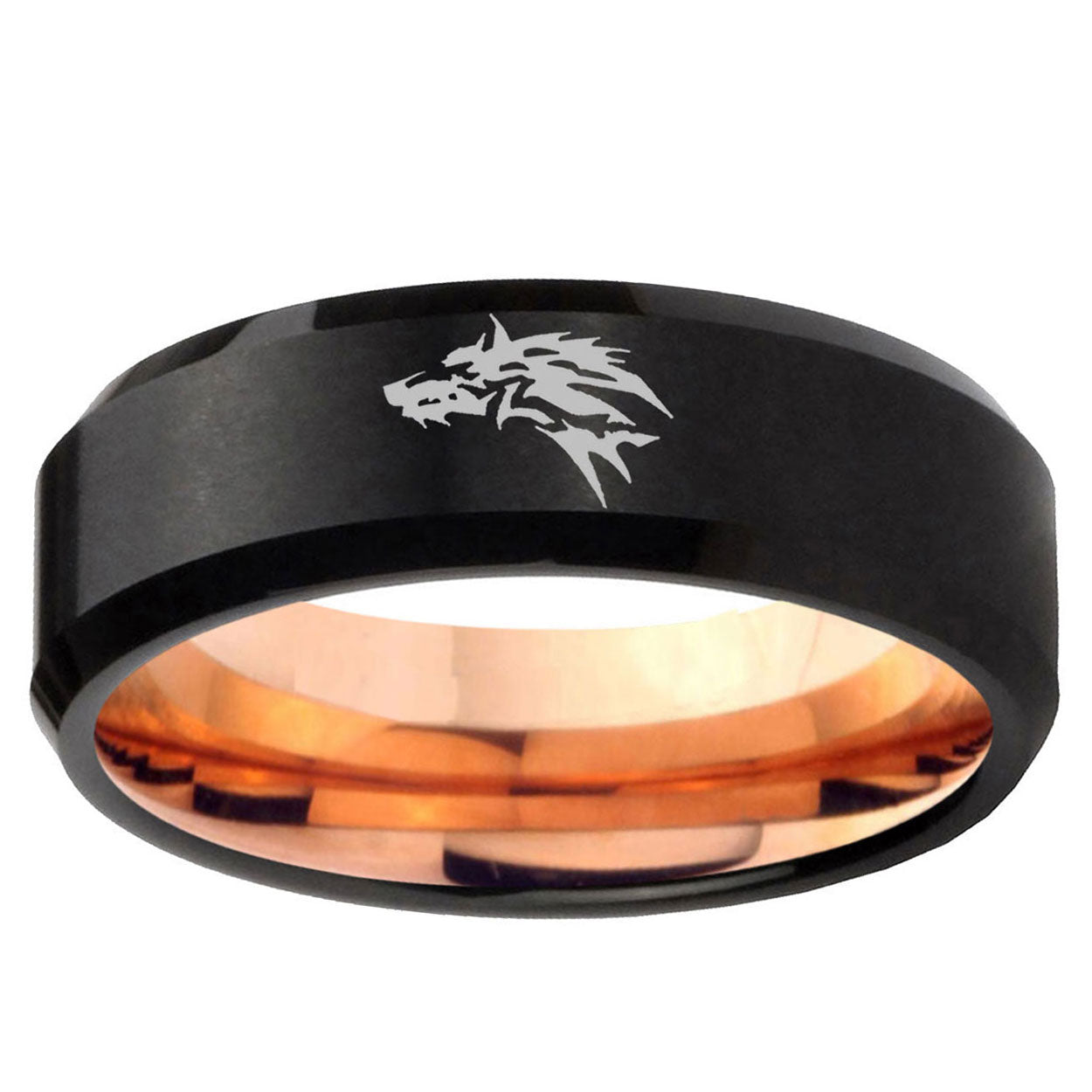 Intruding 5, 8mm Wolf Beveled Edge Rose Gold Black Mens Tungsten Wedding Bands . Offer in both 5mm and 8mm band width black and rose gold plated finished from size 4 to 14