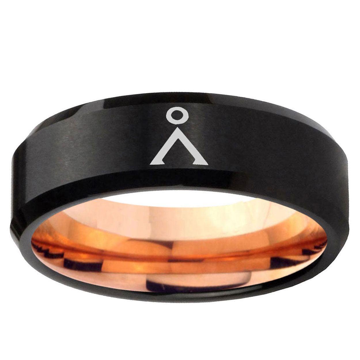 Intruding 5, 8mm Stargate Beveled Edge Rose Gold and Black Tungsten Men's Wedding Ring . Offer in both 5mm and 8mm band width Rose Gold and Black finished from Size 4 to 14