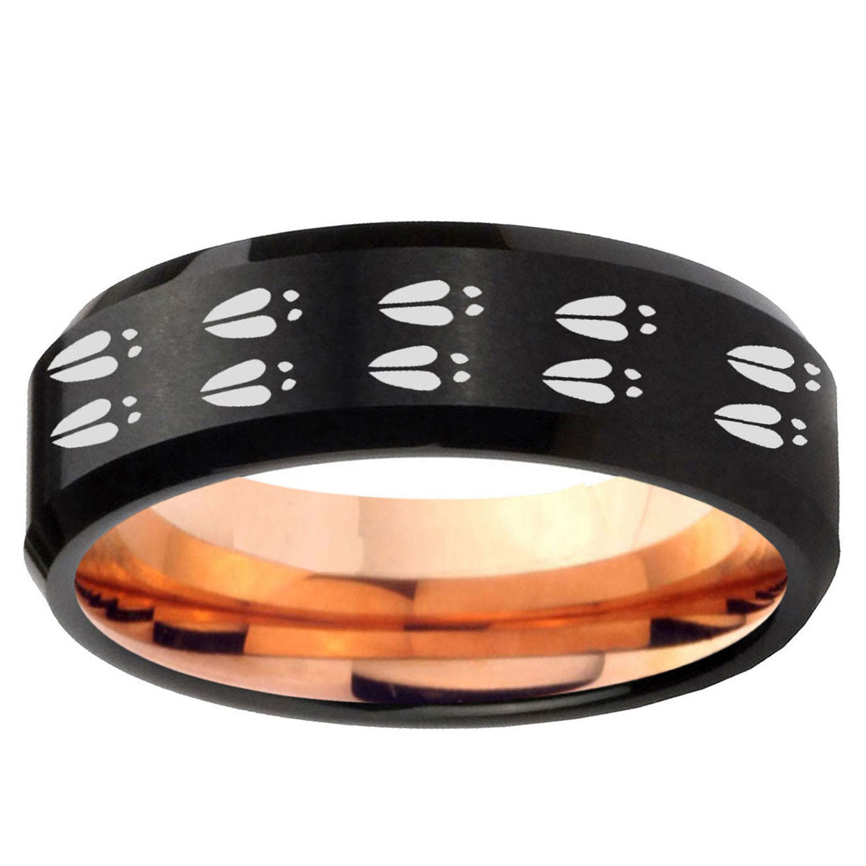Intruding 5, 8mm Deer Tracks Beveled Edge Rose Gold and Black Tungsten Men's Engagement Band . Offer in both 5mm and 8mm band width Rose Gold and Black finished from Size 4 to 14