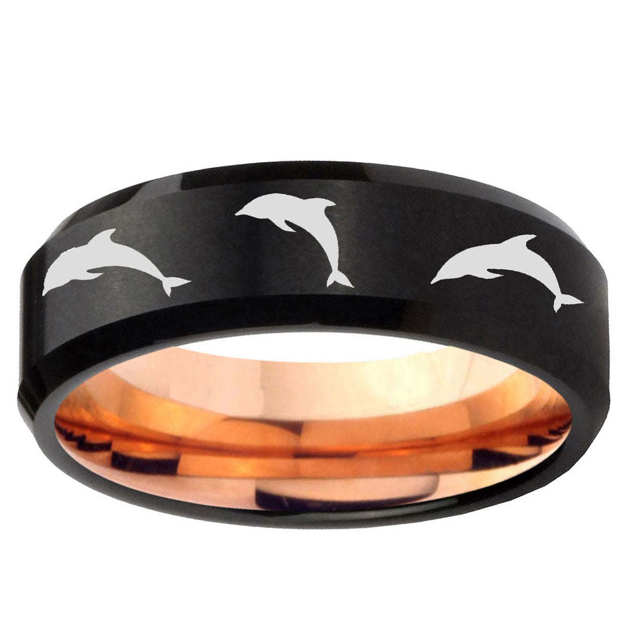 5, 8mm Dolphins Beveled Edge Rose Gold and Black Tungsten Men Engagement Ring