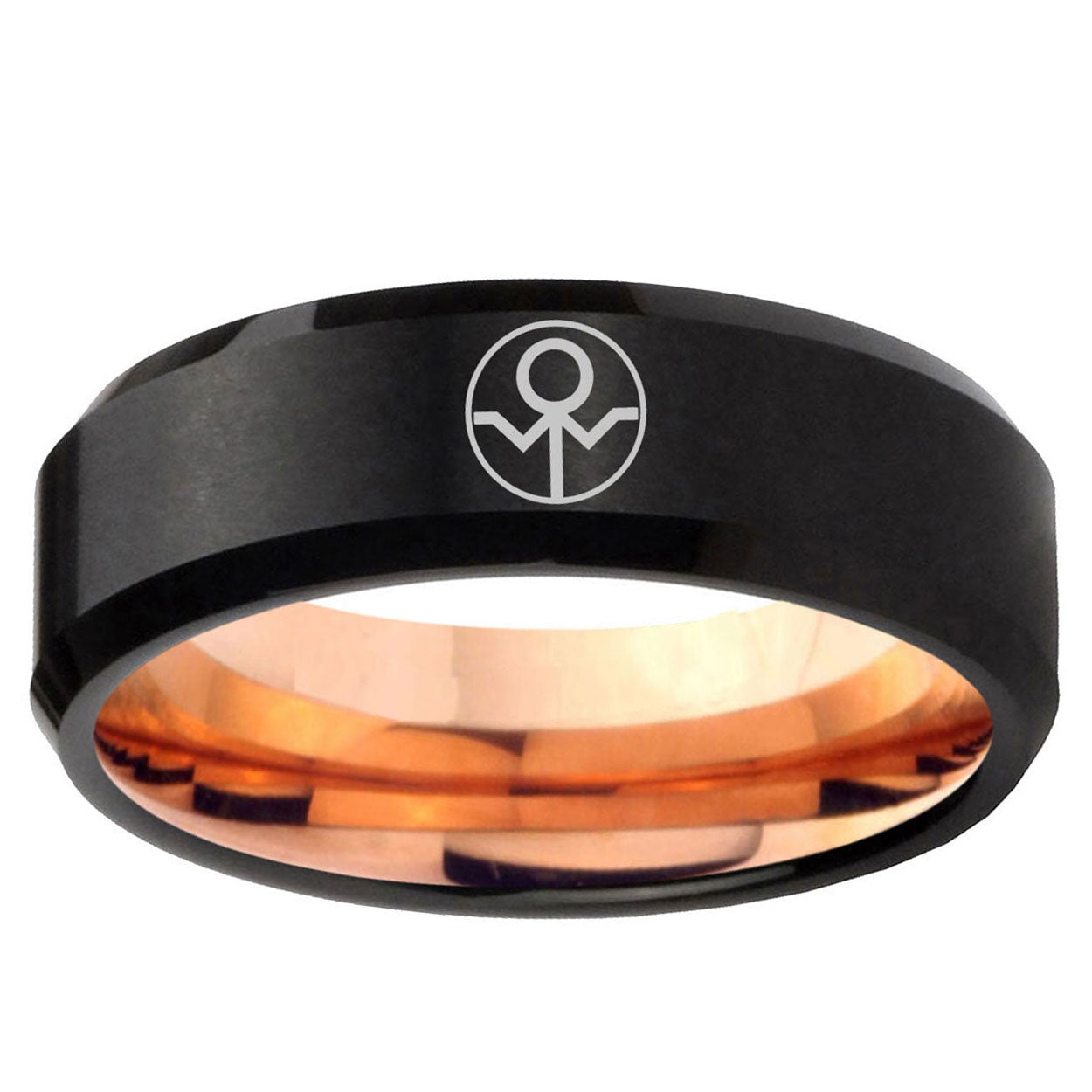 Intruding 5, 8mm Gray Lantern Beveled Edge Rose Gold Black Mens Engraved Rings . Offer in both 5mm and 8mm band width black and rose gold plated finished from size 4 to 14