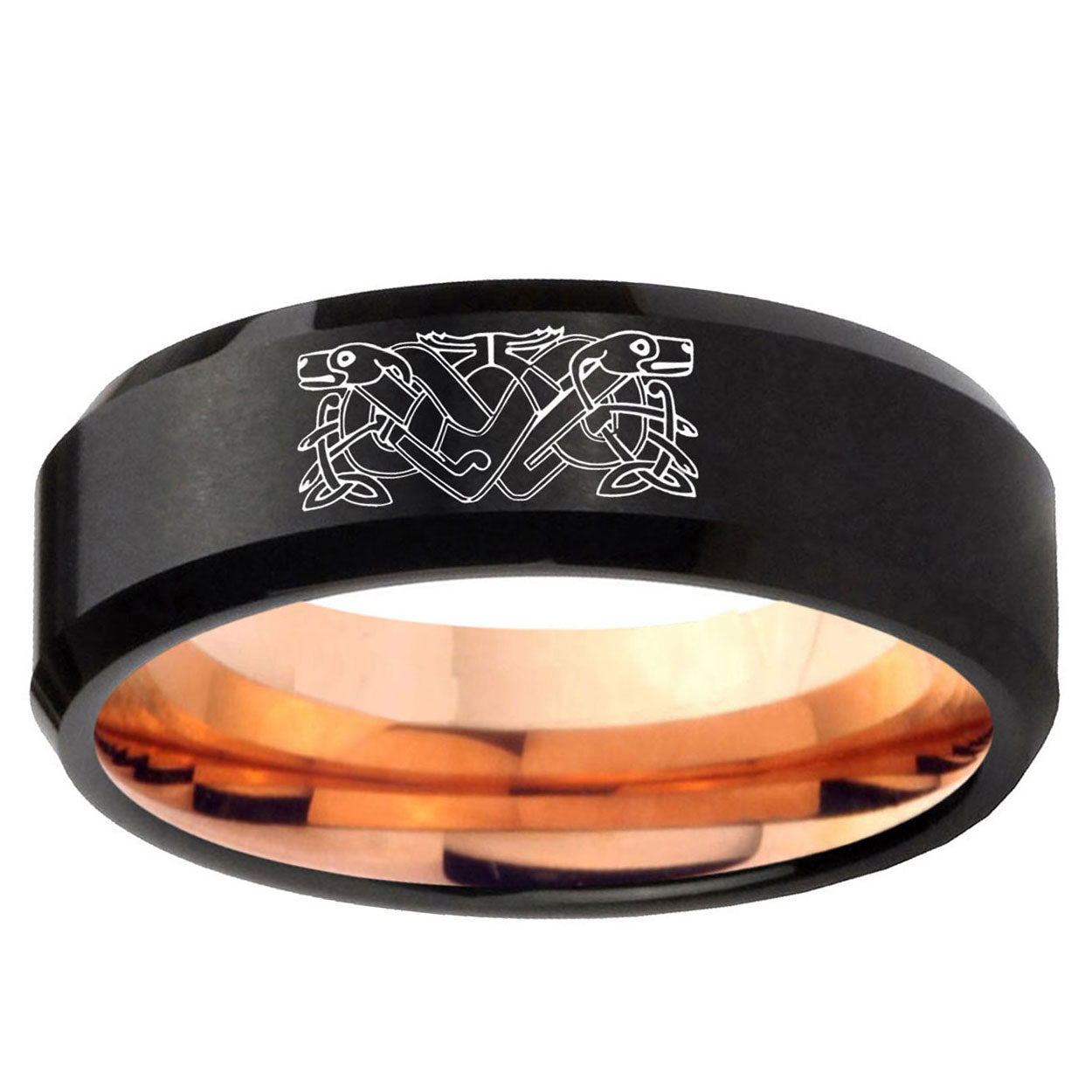 Intruding 5, 8mm Celtic Dog Bevel Tungsten Carbide Rose Gold Men's Ring . Offer in both 5mm and 8mm band width black and rose gold plated finished from size 4 to 14