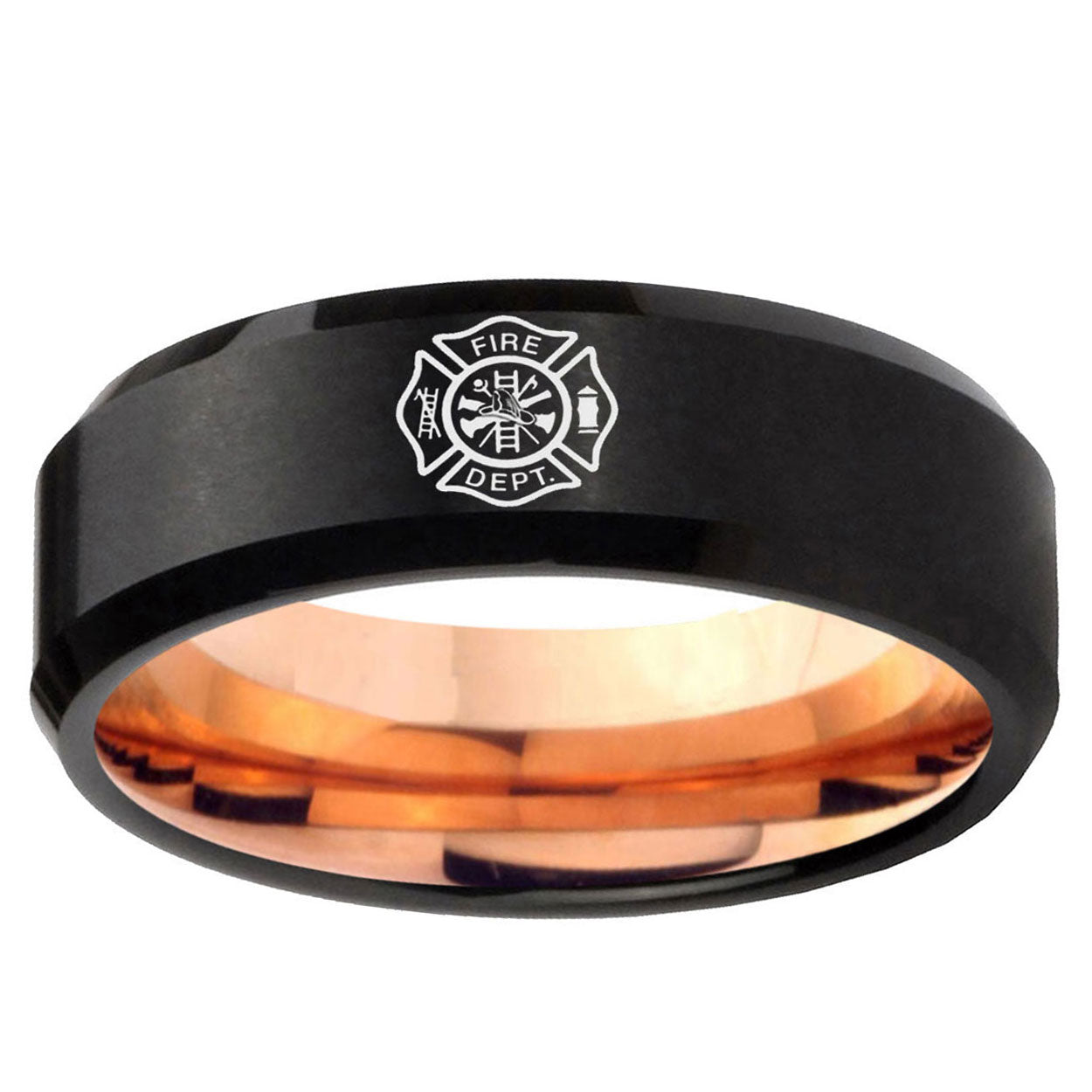 Intruding 5, 8mm Fire Department Bevel Tungsten Carbide Rose Gold Mens Band Ring . Offer in both 5mm and 8mm band width black and rose gold plated finished from size 4 to 14