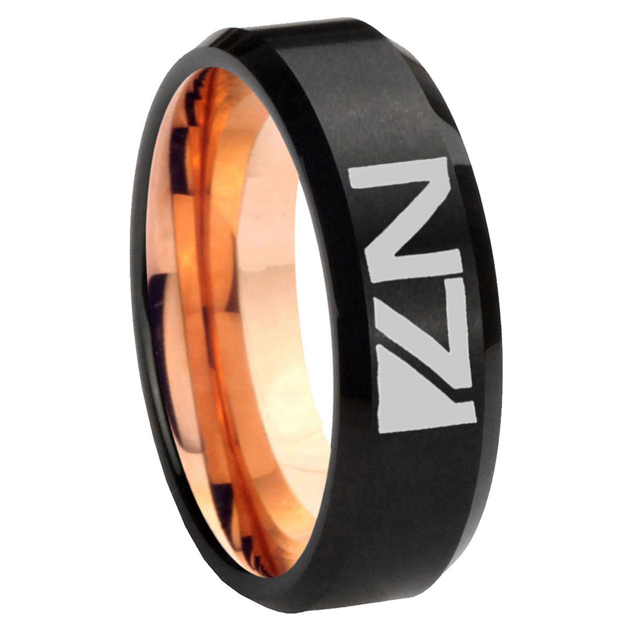 Intruding 5, 8mm N7 Design Bevel Tungsten Carbide Rose Gold Men's Ring . Offer in both 5mm and 8mm band width black and rose gold plated finished from size 4 to 14