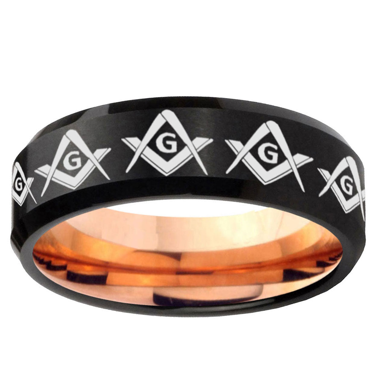 Intruding 5, 8mm Masonic Square and Compass Bevel Tungsten Carbide Rose Gold Men's Ring . Offer in both 5mm and 8mm band width black and rose gold plated finished from size 4 to 14