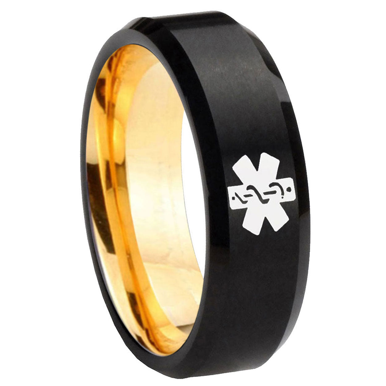 8mm Medical Alert Beveled Tungsten Carbide Black Gold Mens Promise Ring