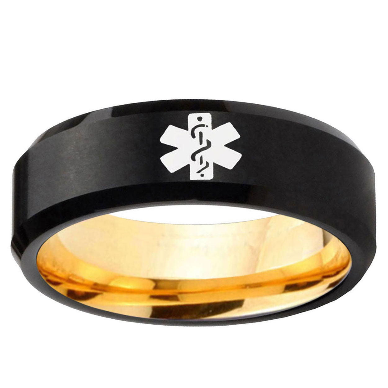 Intruding 8mm Medical Alert Beveled Tungsten Carbide Black Gold Mens Promise Ring . Offer in 8mm band width black and gold plated finished from size 7 to 14
