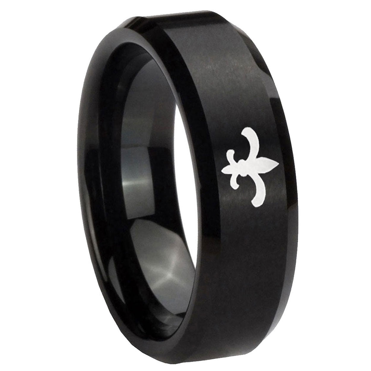 Intruding 5, 8mm Fleur-De-Lis Beveled Edges Brush Black Tungsten Carbide Mens Wedding Band . Offer in both 5mm and 8mm band width brushed black plated finished from size 4 to 14