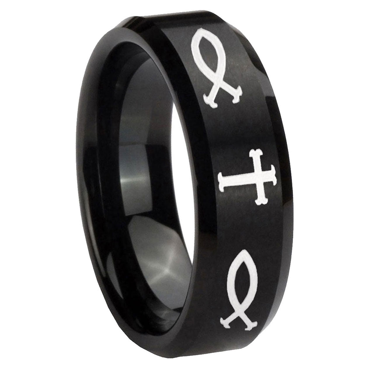 5, 8mm Fish & Cross Beveled Edges Brush Black Tungsten Wedding Engagement Ring