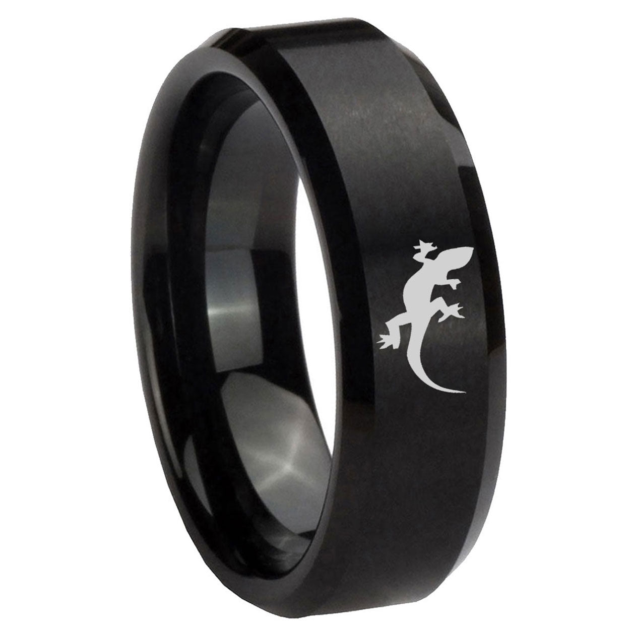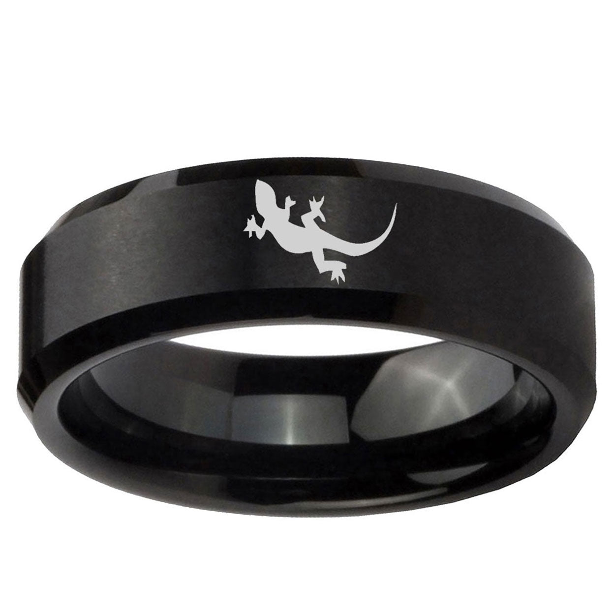 Intruding 5, 8mm Lizard Beveled Edges Brush Black Tungsten Carbide Mens Anniversary Ring . Offer in both 5mm and 8mm band width brushed black plated finished from size 4 to 14