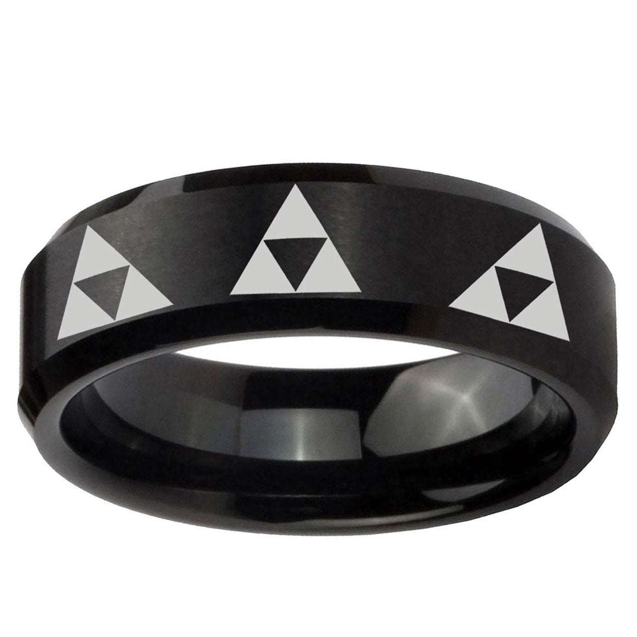 Intruding 5, 8mm Multiple Zelda Triforce Beveled Brush Black Tungsten Custom Ring for Men . Offer in both 5mm and 8mm band width brushed black plated finished from size 4 to 14