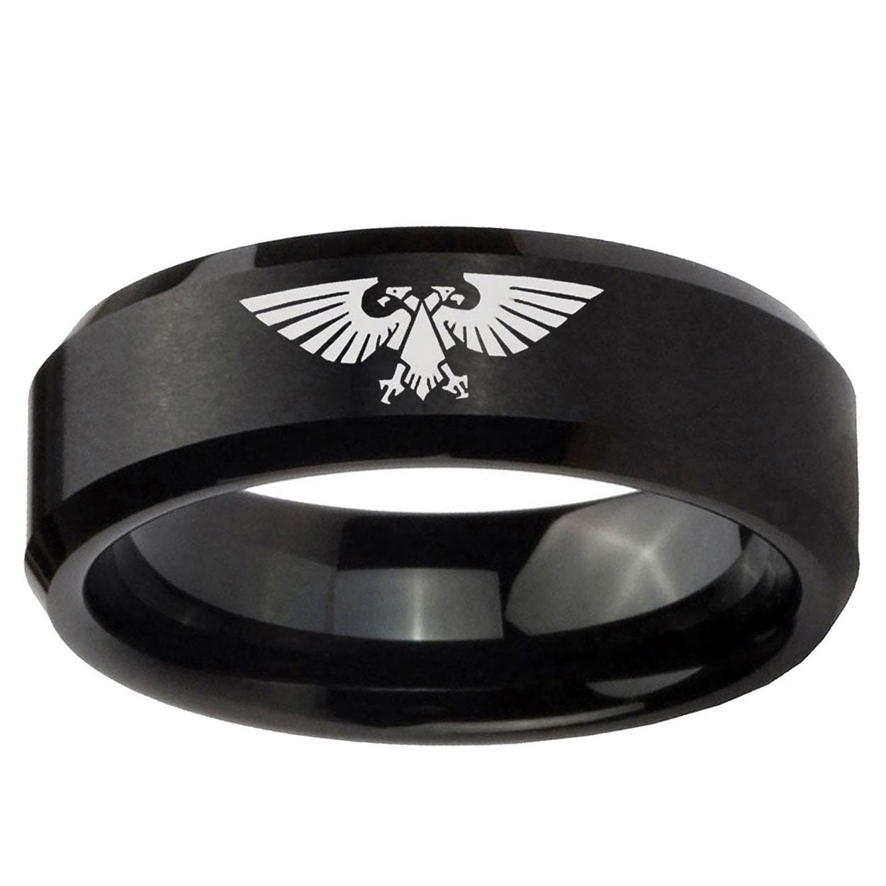 Intruding 5, 8mm Aquila Beveled Edges Brush Black Tungsten Carbide Men's Band Ring . Offer in both 5mm and 8mm band width brushed black plated finished from size 4 to 14