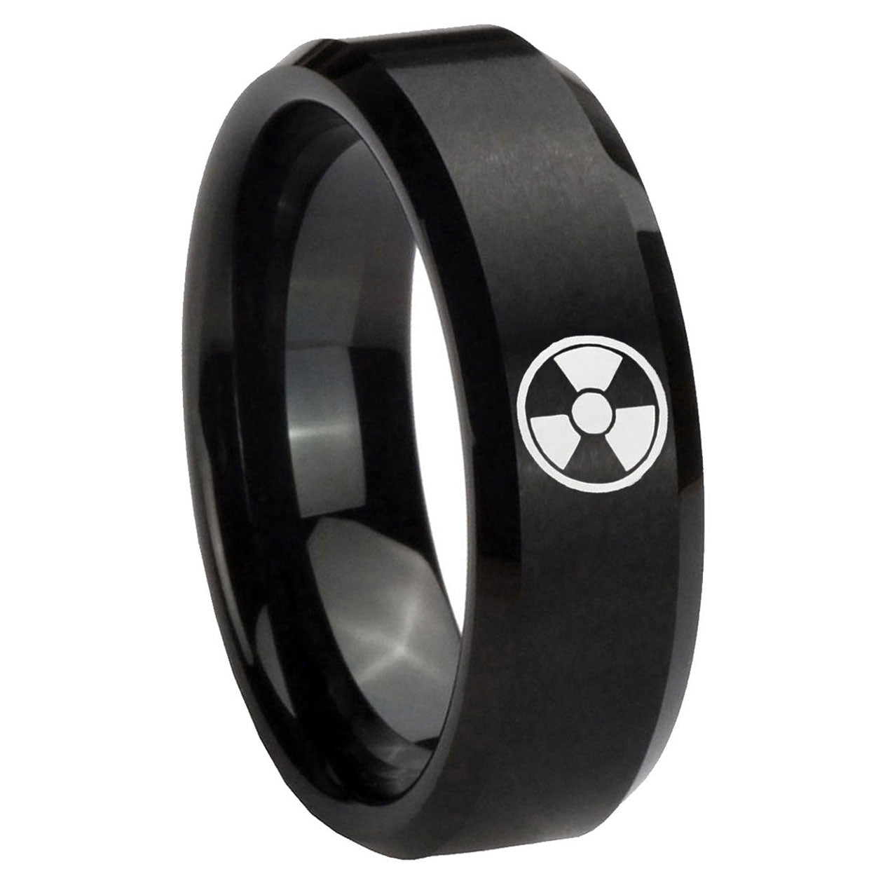 Intruding 5, 8mm Radiation Beveled Edges Brush Black Tungsten Carbide Men's Engagement Band . Offer in both 5mm and 8mm band width brushed black plated finished from size 4 to 14