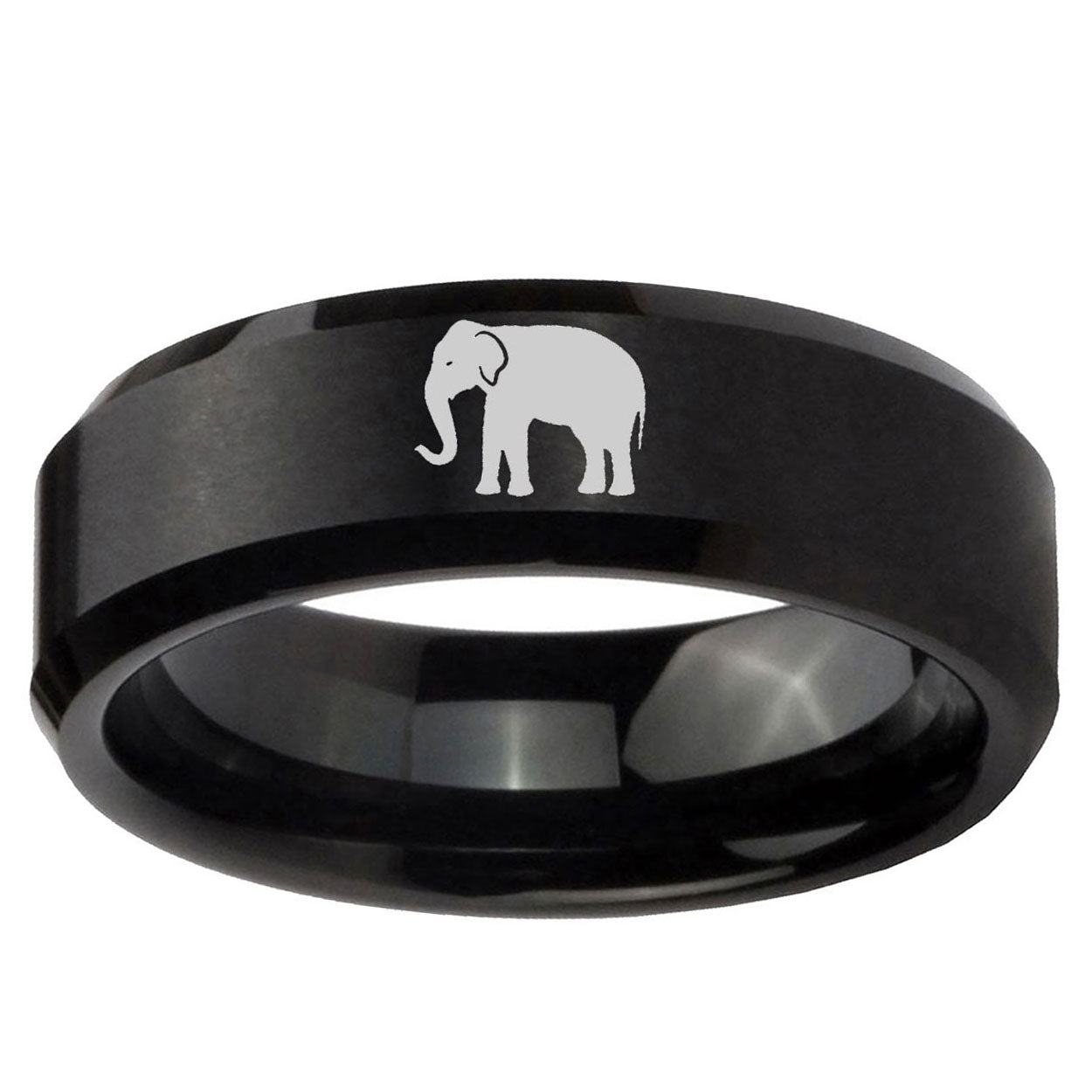 Intruding 5, 8mm Elephant Beveled Edges Brush Black Tungsten Carbide Rings for Men . Offer in both 5mm and 8mm band width brushed black plated finished from size 4 to 14