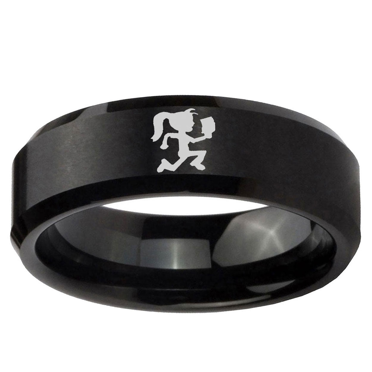 Intruding 5, 8mm Hatchet Woman Beveled Edges Brush Black Tungsten Carbide Rings for Men . Offer in both 5mm and 8mm band width brushed black plated finished from size 4 to 14