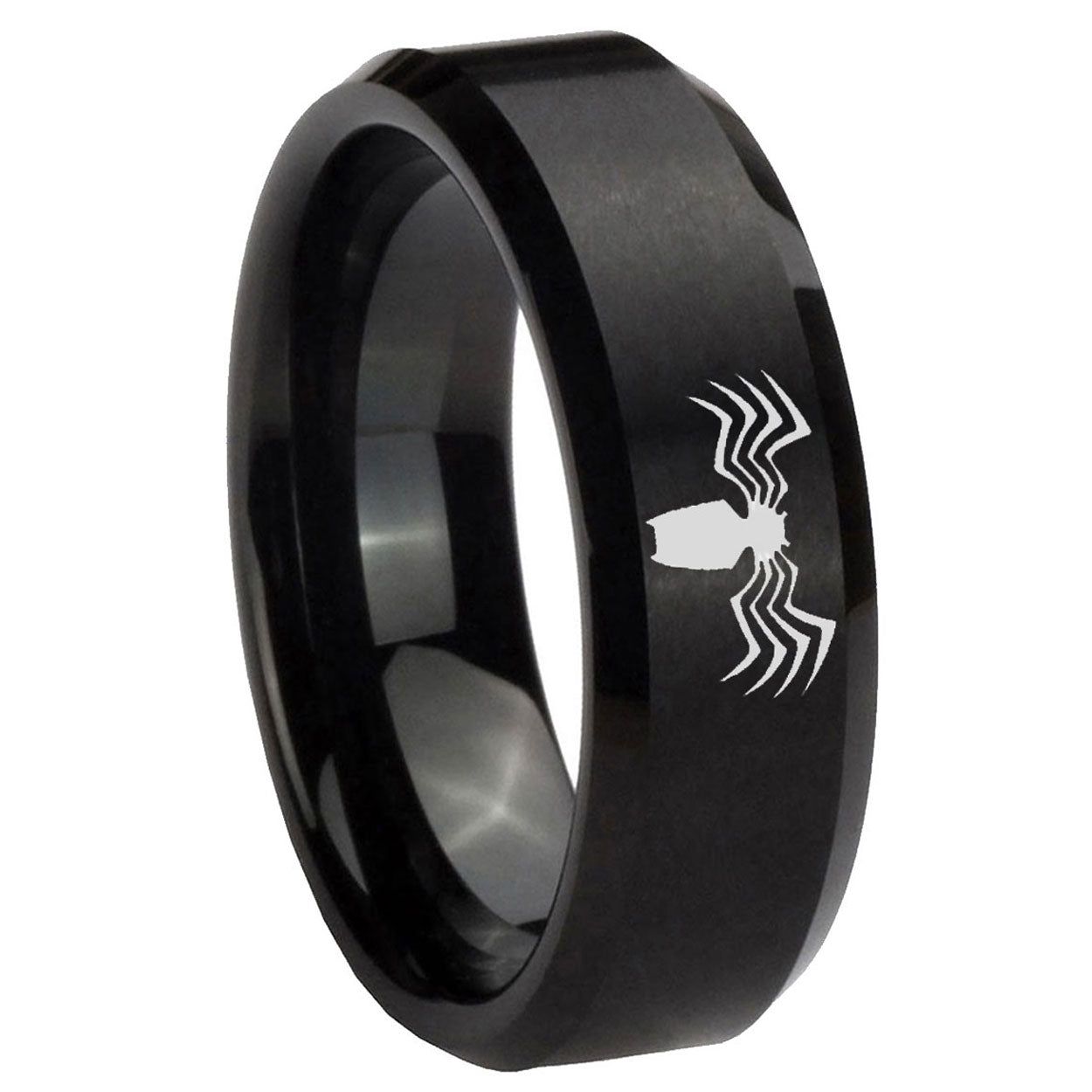 Intruding 5, 8mm Spider Beveled Edges Brush Black Tungsten Carbide Men's Ring . Offer in both 5mm and 8mm band width brushed black plated finished from size 4 to 14