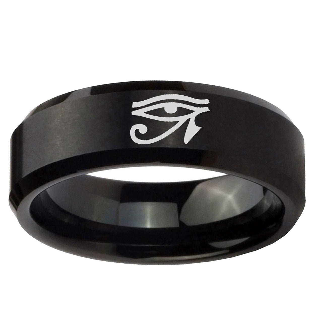 Intruding 5, 8mm Seeing Eye Beveled Edges Brush Black Tungsten Carbide Anniversary Ring . Offer in both 5mm and 8mm band width brushed black plated finished from size 4 to 14