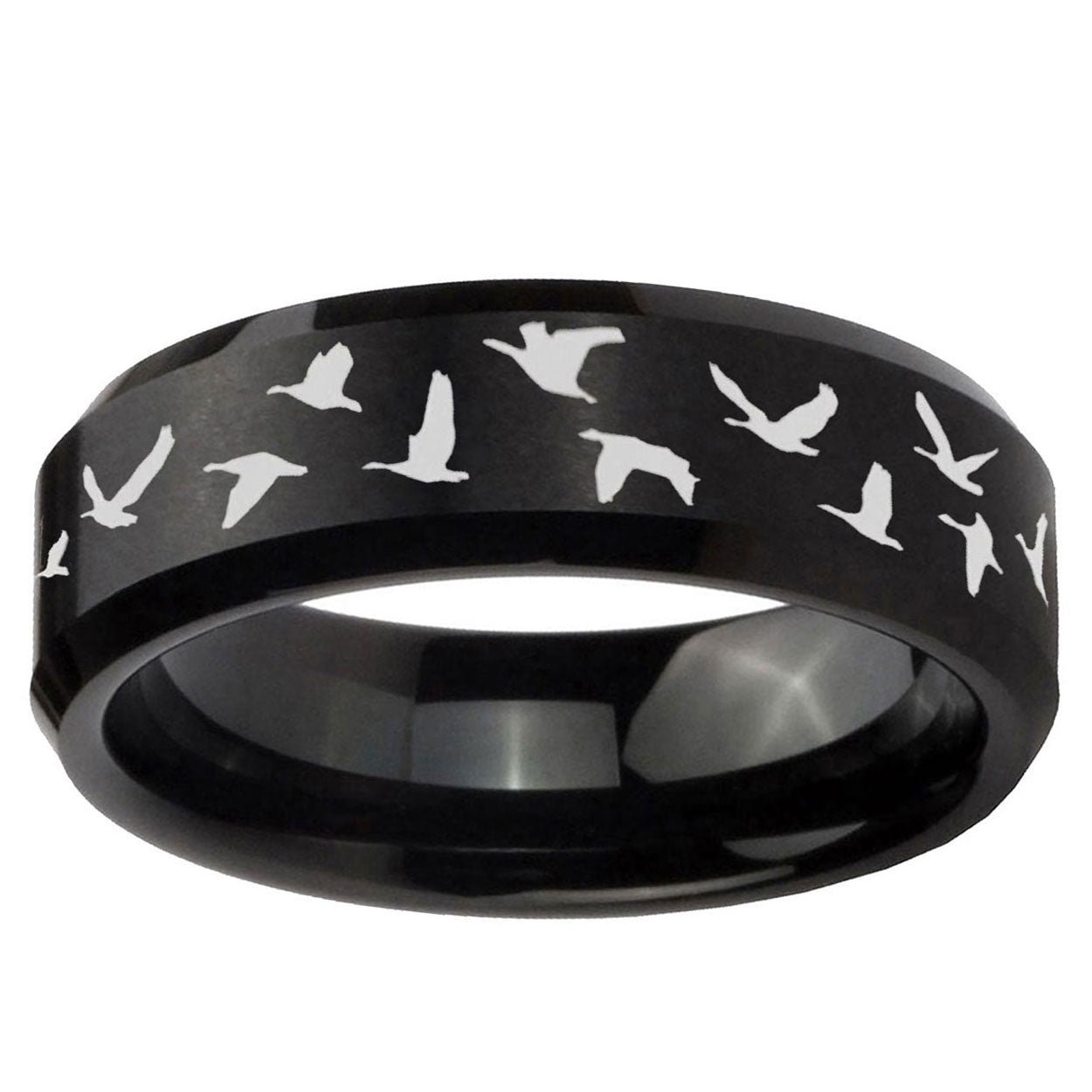 Intruding 5, 8mm Flying Geese Hunting Beveled Edges Brush Black Tungsten Carbide Rings for Men . Offer in both 5mm and 8mm band width brushed black plated finished from size 4 to 14