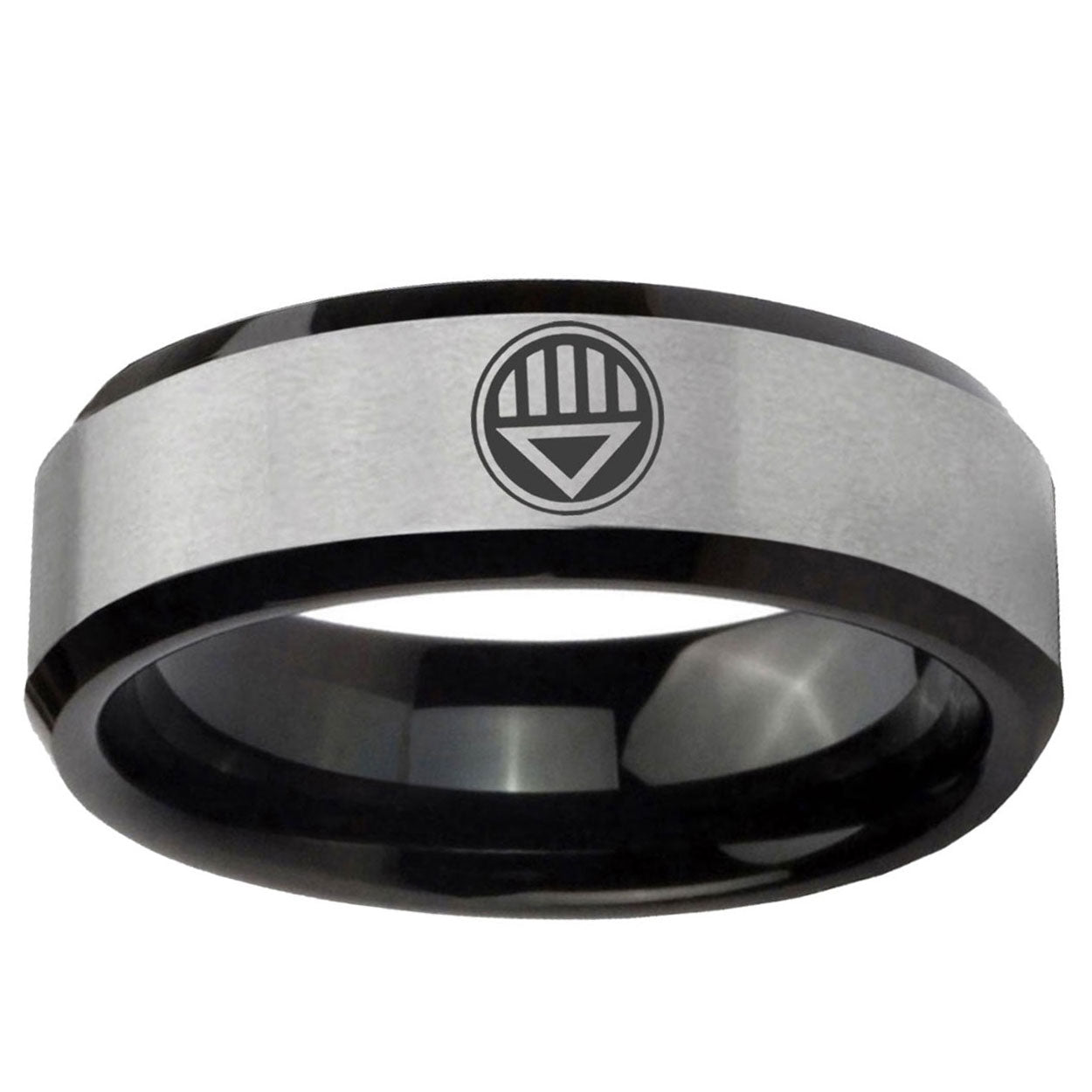 Intruding 5, 8mm Lantern Corps Beveled Edge Black Silver Custom Engraved Ring . Offer in both 5mm and 8mm band width brush black 2 tone finished from size 4 to 14