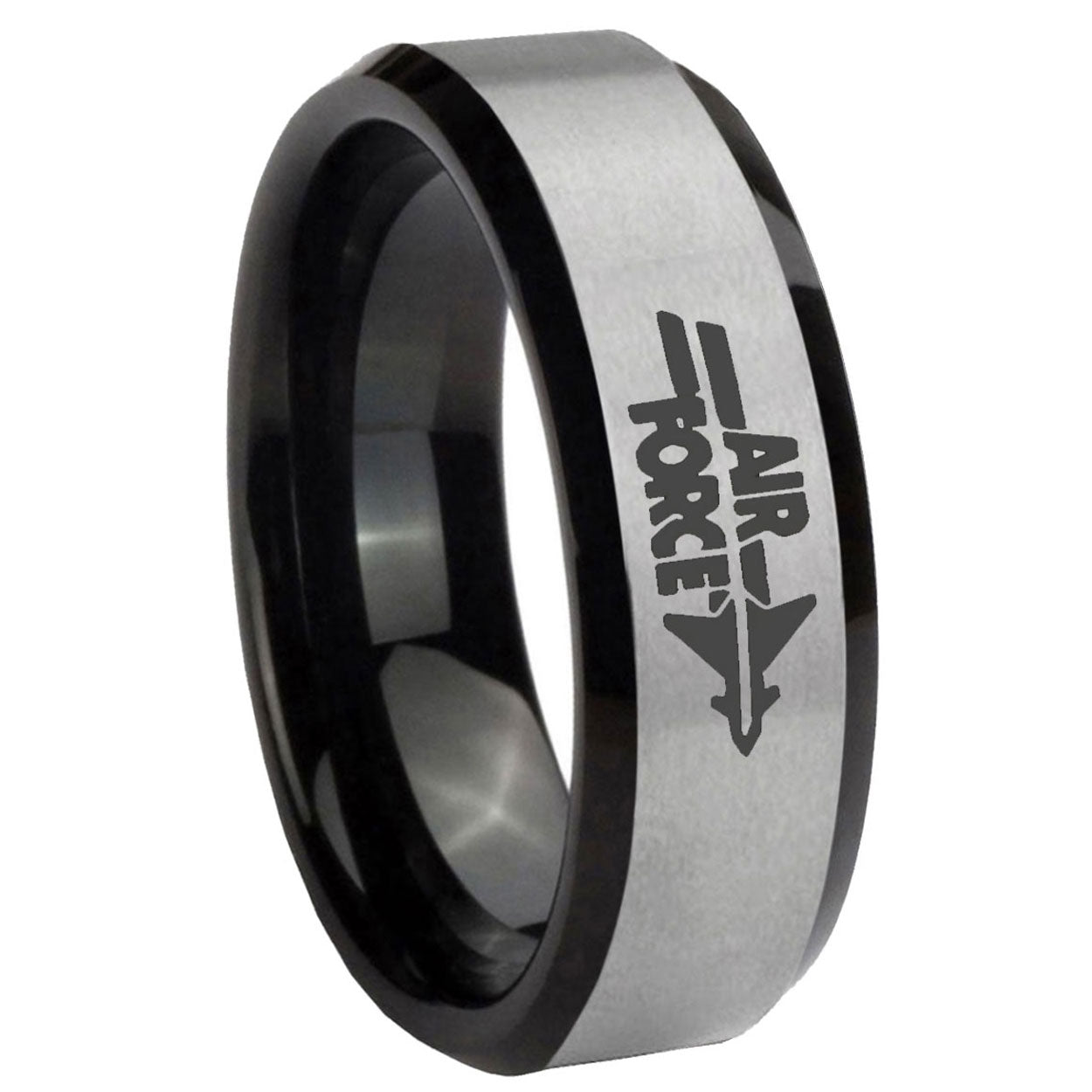 Intruding 5, 8mm Silver Black Bevel Edges Air Force Tungsten 2 Tone Laser Engraved Ring . Offer in both 5mm and 8mm band width brush black 2 tone finished from size 4 to 14