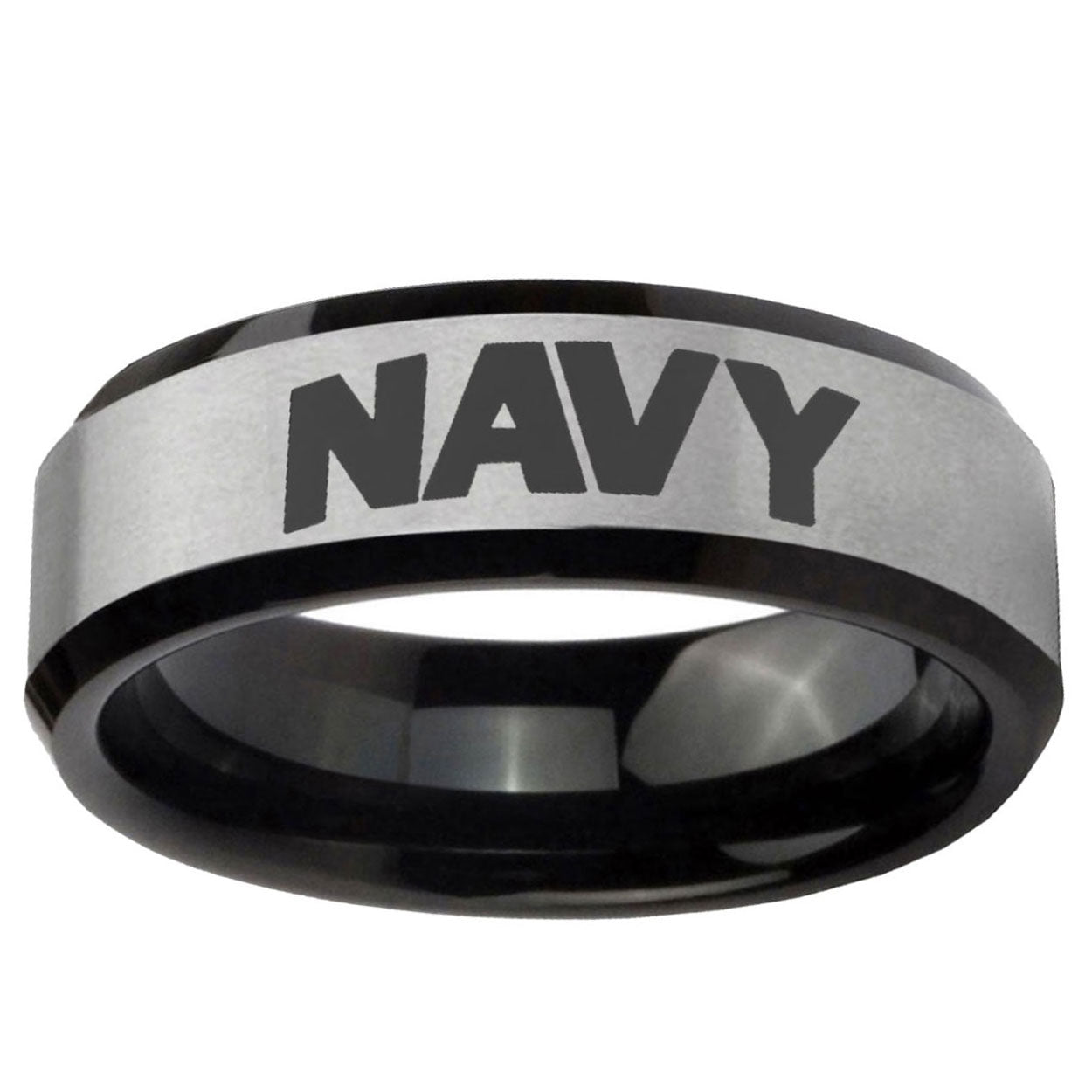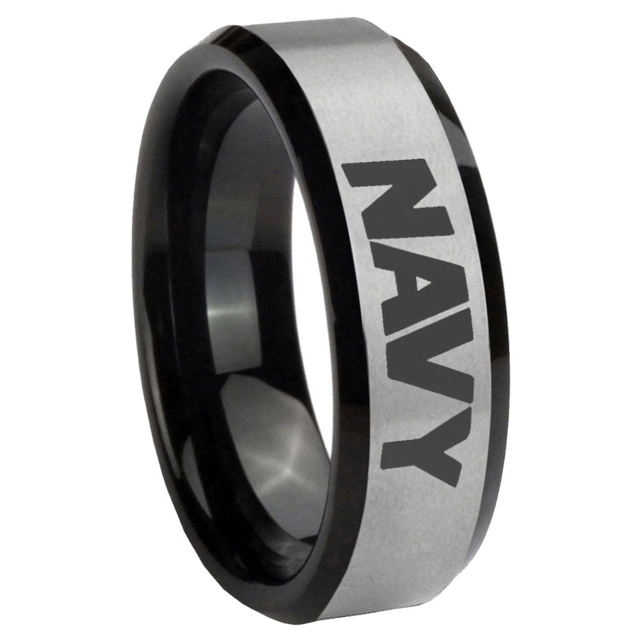 Intruding 5, 8mm Navy Beveled Edges Brush Black 2 Tone Tungsten Carbide Men's Wedding Ring . Offer in both 5mm and 8mm band width brush black 2 tone finished from size 4 to 14