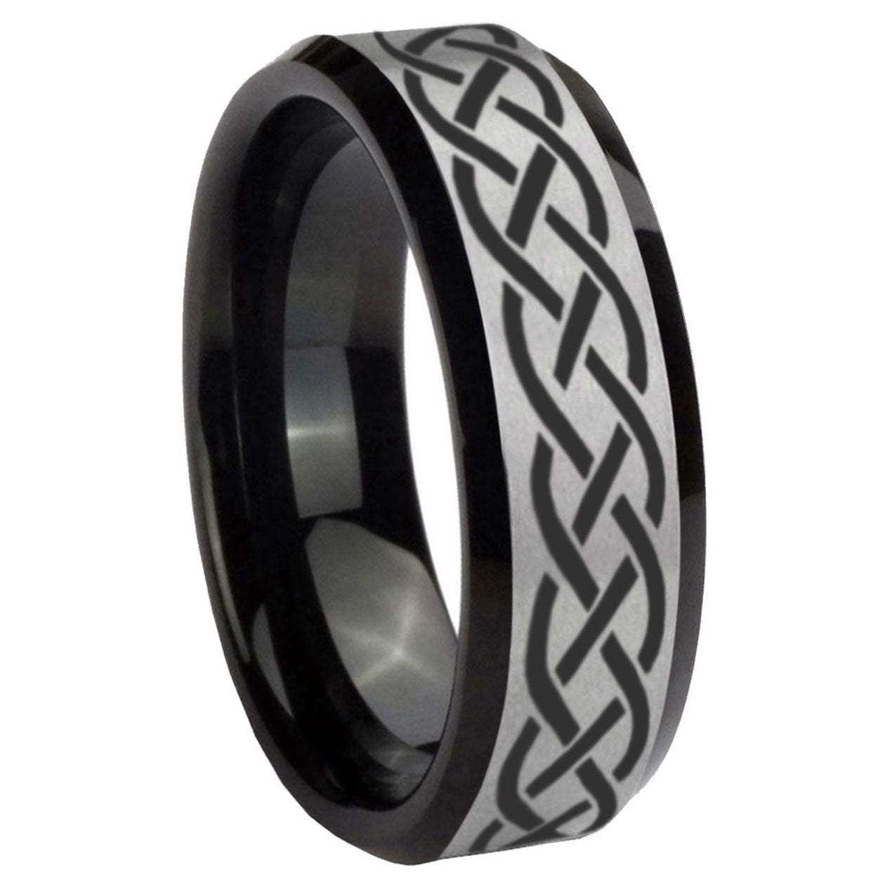 Intruding 5, 8mm Celtic Knot Beveled Brush Black 2 Tone Tungsten Wedding Engraving Ring . Offer in both 5mm and 8mm band width brush black 2 tone finished from size 4 to 14